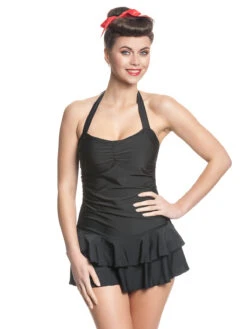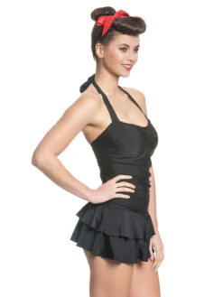 Badenixen aufgepasst! Pussy Deluxe hat diesen Sommer zuckersüße Bademode für euch im Programm. Dieser schwarze Badeanzug ist wie ein kurzes Kleidchen mit Rüschenrock gearbeitet. Er hat breite Neckholder Träger. Der Überrock des Badeanzuges ist fest mit dem Badeanzug verbunden und mit zwei Rüschenvolants dekoriert. Der Badeanzug ist rückenfrei.
