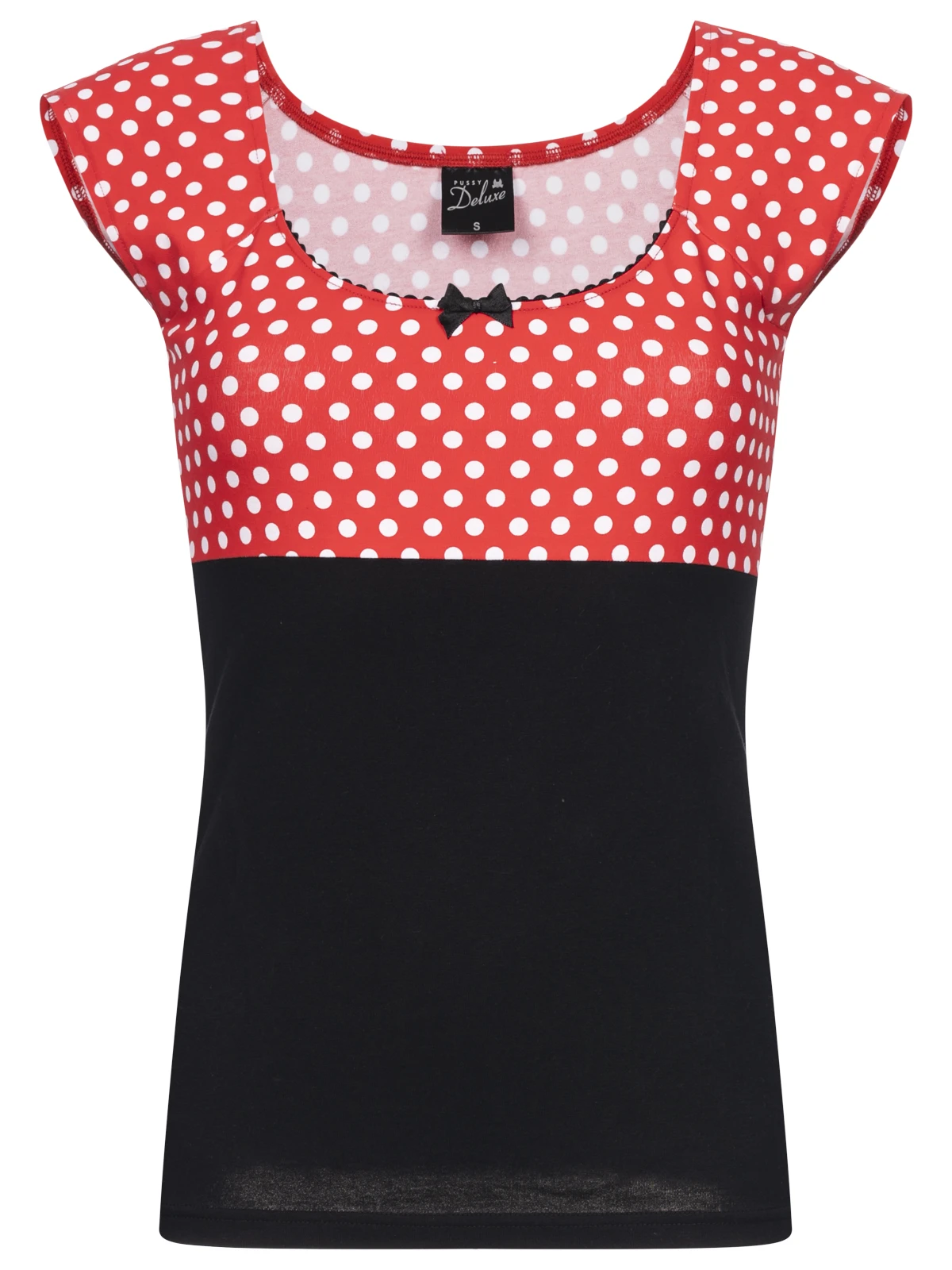 Das tolle Basic-Shirt ist aus einem angenehmen Baumwollmaterial mit Elasthananteil. Es ist figurbetont geschnitten, hat kurze Ärmel und einen großen Halsausschnitt, der mit einer schwarzen Litze und einer kleinen Satinschleife verziert ist. Der komplette obere Bereich ist aus einem einen süßen Pünktchenprint auf rotem Stoff. Das restliche Shirt hebt sich schwarz ab und unterstreicht damit noch den fröhlichen und sommerlichen Look. Das beste ist, das Basic-Shirt gibt es in unterschiedlichen Varianten und Farben. Von Kirschen über Karos oder Leoprint ist wirklich alles dabei. So findet jeder seinen absoluten Liebling.