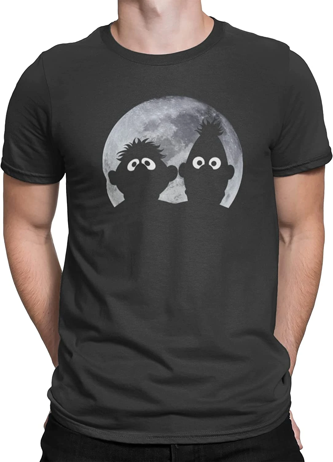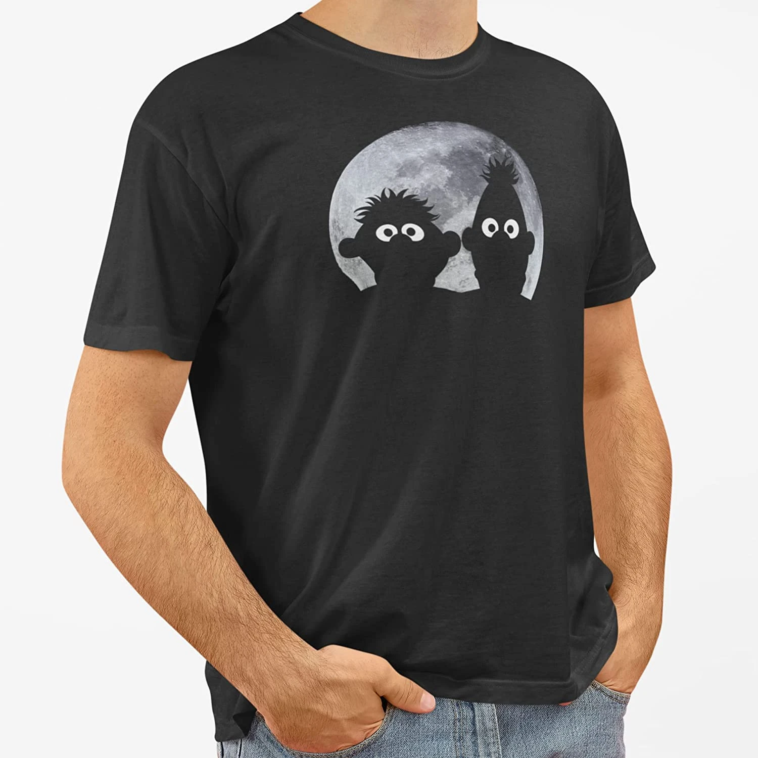 Der coole Druck zeigt Ernie und Bert, die vor einem Vollmond stehen. Der Mond ist in grautönen gehalten und hebt sich somit ab, während Ernie und Bert in den Farben des Shirts gehalten sind. Ein tolles Design für alle Fans der Kultssendung ‚Sesamstraße‘.