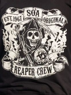 Auf der linken Brust findet sich in klein das Logo der ‚Sons of Anarchy‘, auf den Ă„rmeln steht jeweils der Schriftzug. Ăśber den ganzen RĂĽcken befindet sich ebenfalls das Logo und somit der perfekte Nachweis, fĂĽr deine Mitgliedschaft in diesem Club.