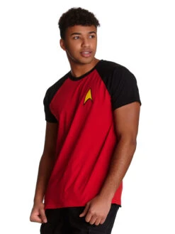 Wo sind die Trekkie Fans? Dieses coole Herrenshirt ist aus einem angenehmen Baumwollmaterial mit Elasthananteil. Es ist im Raglan-Stil geschnitten und hat eine gerade Passform. Das Shirt hat kurze Arme und einen runden Halsausschnitt. Es ist rot, die Armeinsätze haben sich schwarz ab. Ganz dezent ist auf der Brust in gelb das Star Trek Symbol aufgedruckt. Wenn auch du gerne mal mit Spock oder Kirk an Bord der Enterprise wärst, dann ist dieses Shirt garantiert das richtige für dich.