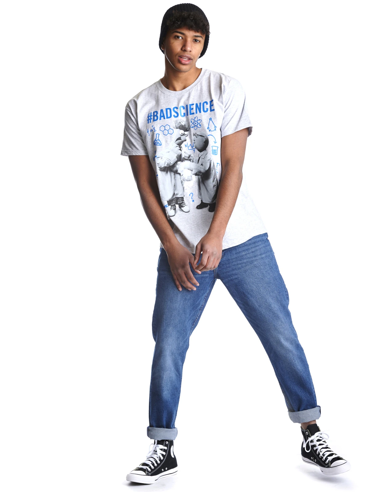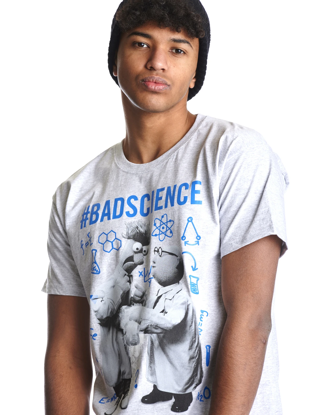 Der witzige Aufdruck zeigt Prof. Dr. Honigtau Bunsenbrenner mit einem rauchenden Reagenzglas in der Hand, sowie seinen entsetzt drein blickenden Assistenten Beaker. Über den beiden steht #badscience, also #schlechte Wissenschaft und um sie herum sind in blau verschiedene wissenschaftliche Symbole oder Formeln gedruckt. Wahrscheinlich eine typische Szene aus dem Muppetschen Wisschaftslabor. Wenn auch du ein Fan dieses leicht verrückten Erfinders bist, dann ist dieses Shirt genau das richtige für dich.