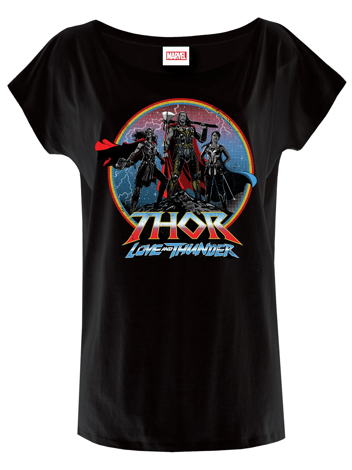 Der Druck zeigt eine Szene aus Thor – Love and Thunder. Thor, in der Mitte, links und rechts von ihm sieht man Valkyrie und Jane Foster. Alles ist in einem Kreis abgebildet.