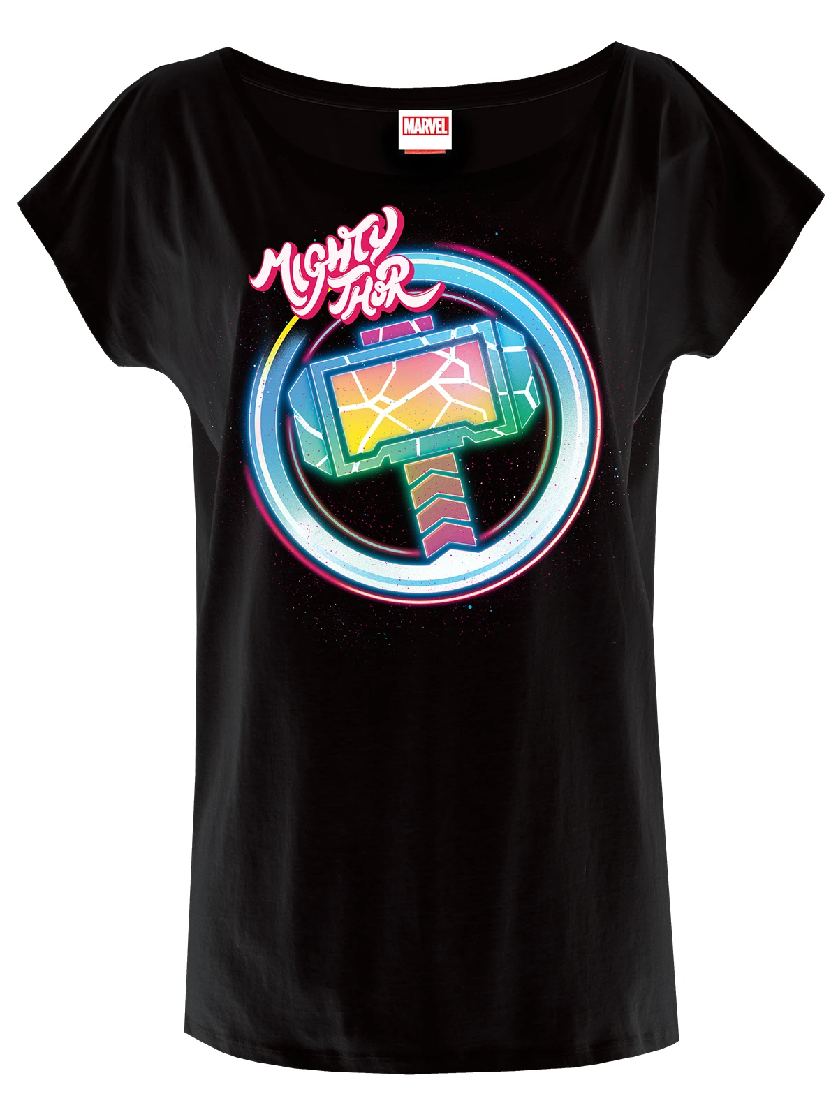 Der coole Druck zeigt eine Abbildung von Thors Hammer, umgeben von einem Kreis und dem Schriftzug ‚Mighty Thor‘ was soviel bedeutet wie ‚mächtiger Thor‘. Der Druck ist in neonfarben gehalten.