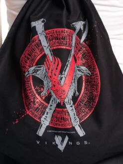 Der Aufdruck zeigt ein rundes Wappen mit keltischen Symbolen. Davor zwei gekreuzte Äxte mit Raben und dem Vikings Logo. Das schöne an dem Beutel oder der Tasche ist, dass sie vielseitig einsetzbar ist.