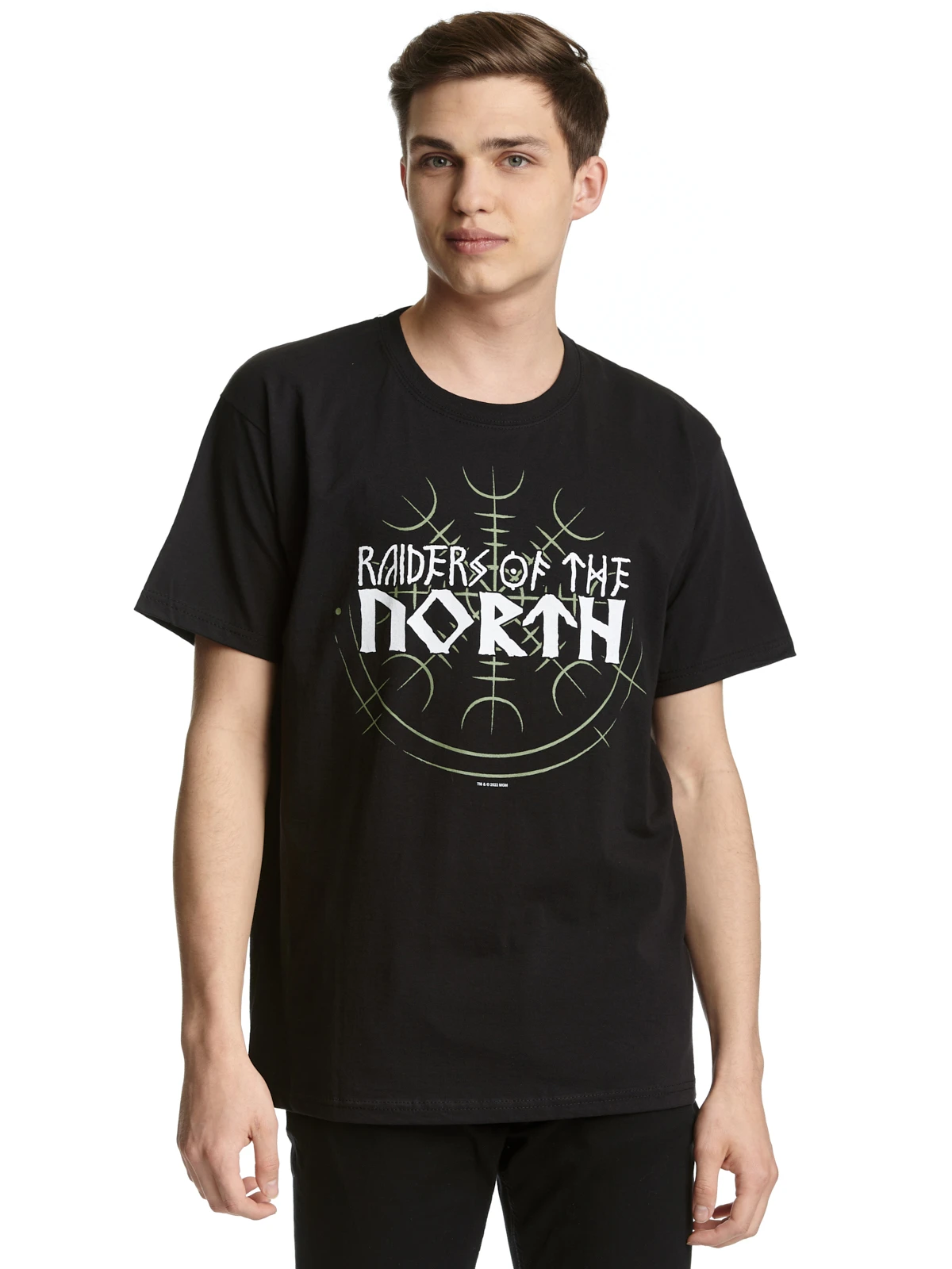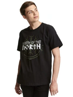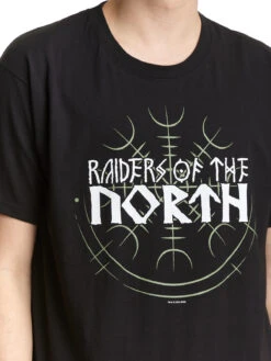 Der coole Druck zeigt den Schriftzug ‚Raiders of the North‘ was ĂĽberstzt so viel wie ‚Jäger des Nordens‘ bedeutet. Der Schriftzug ähnelt Runen. Im Hintergrund sieht man einen Kreis mit keltischen Zeichen.