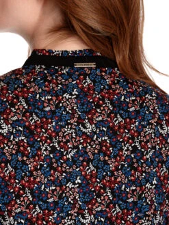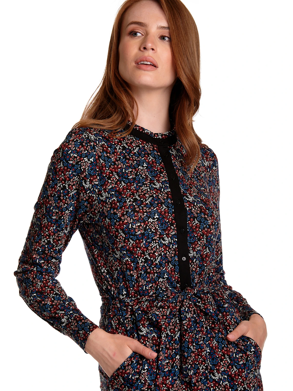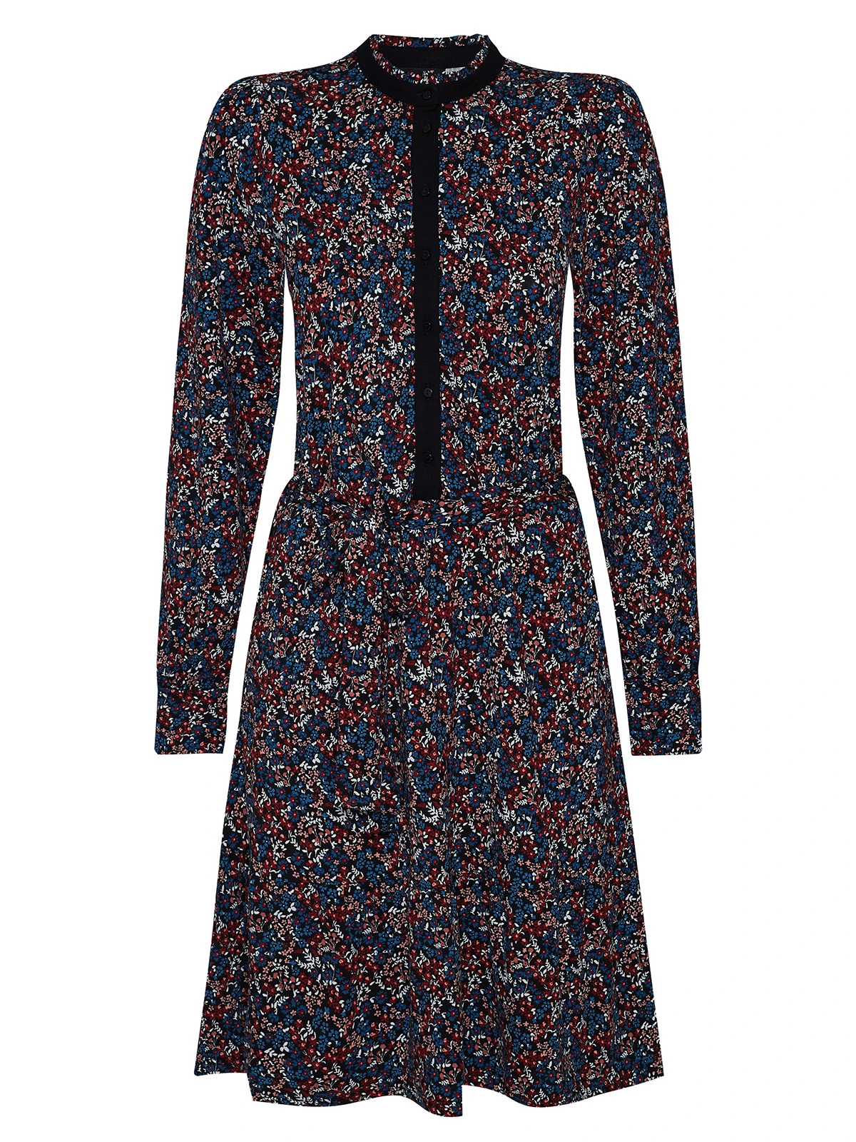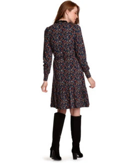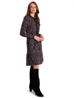 Das wunderschöne Vive Maria Kleid ist aus einem angenehmen Viskosematerial mit Elasthananteil. Der Futterstoff im Rockteil ist aus Polyester. Das Kleid ist in sanfter A-Linie geschnitten und hat lange Arme, die mit einer Manschette in Stofffarbe abgeschlossen werden. Der runde Halsausschnitt geht direkt in einen kleinen Stehkragen über, der mit einem schwarzen Einfassband und einer Rüsche verziert ist. Die Knopfleiste, ebenfalls aus einem schwarzen Band, reicht bis zur Teilungsnaht auf Taillenhöhe, die das figurbetonte Oberteil vom leicht ausgestellten Rockteil trennt. Seitlich Eingrifftaschen sowie ein Bindegürtel lockern den Look auf und sorgen für einen bequemen Sitz. Das Kleid fällt dank dem Unterstoff aus Polyester angenehm und locker um die Beine. Das Muster zeigt einen Blumenprint in herbstlichen Farben auf schwarzem Stoff. Das ‚Amelie Dress‘ ist super bequem und schick zugleich. Es kann in der Übergangszeit mit Sneakern oder Boots kombiniert werden.