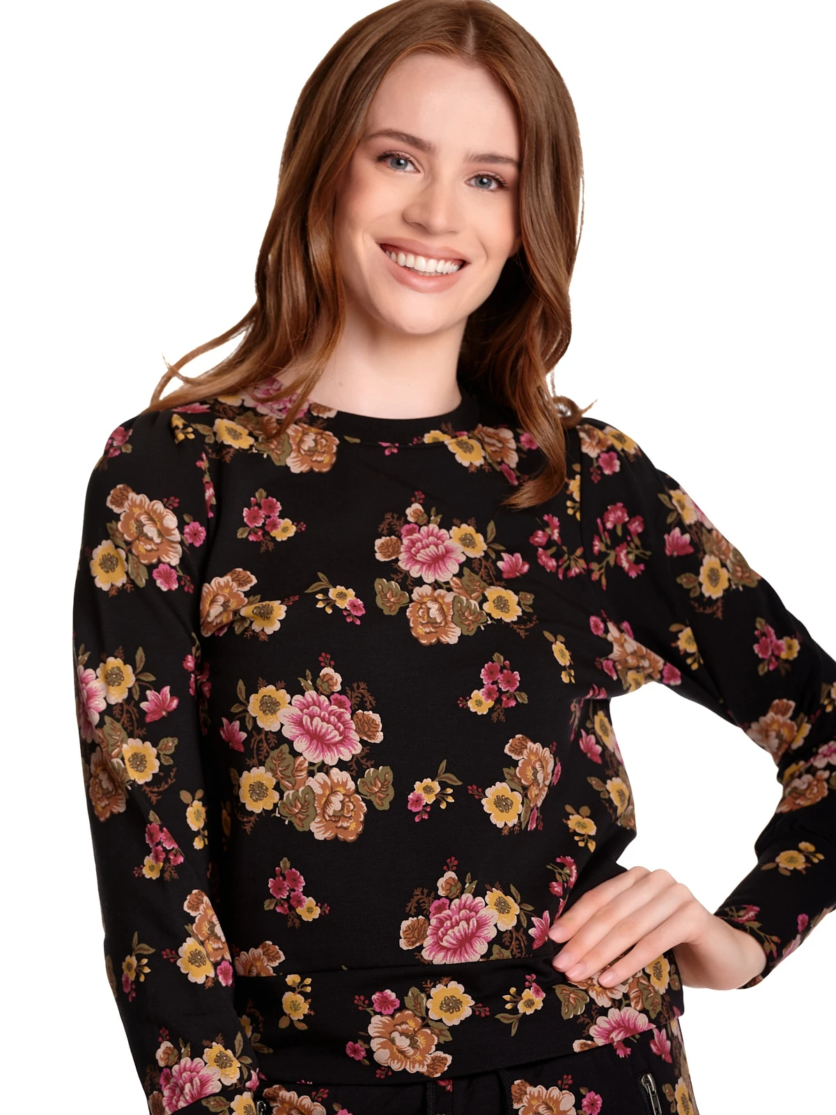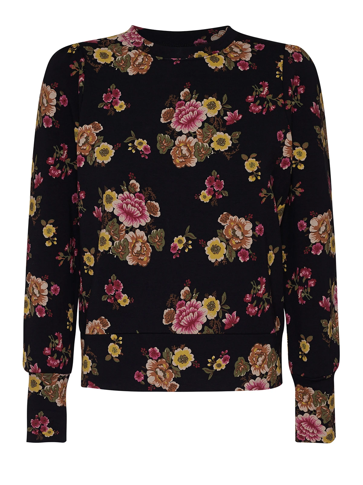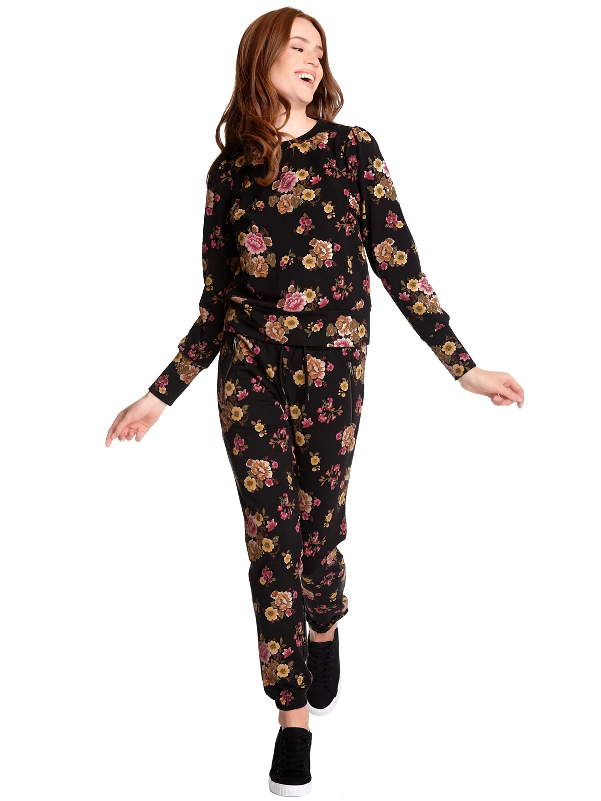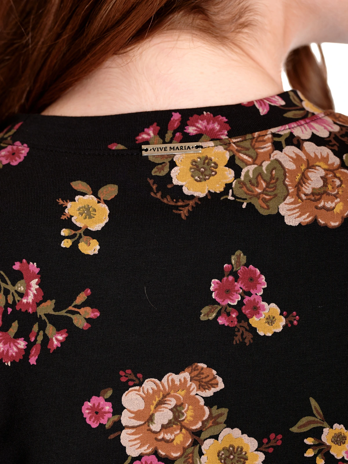 Der coole Vive Maria Sweater ist aus einem leichten Baumwoll-Modal-Gemisch mit Elasthananteil. Er ist gerade geschnitten und hat lange Arme, die, genau wie der untere Saum, mit einem breiten BĂĽndchen in Stofffarbe abgeschlossen werden. Am runden Halsausschnitt ist eine Blende in Stofffarbe angesetzt. Das Muster zeigt einen herbstlichen Blumenprint auf schwarzem Stoff. Der ‚Barock Sweater‘ passt hervorragend zur Bluejeans und Sneakern.