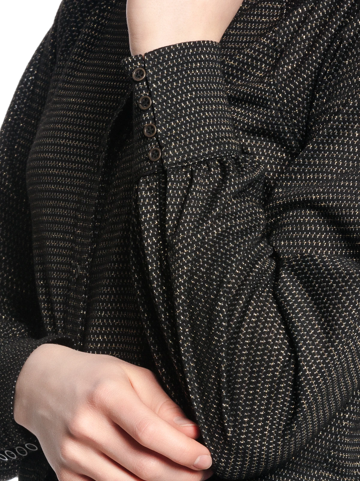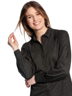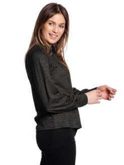 Die coole Vive Maria Bluse ist aus einem leichten Polyester-Viskosematerial mit Metallicgarnanteil. Sie hat lange Arme, die mit Manschetten abgeschlossen werden. Die Bluse hat eine gerade Passform und eine durchgehende Knopfleiste. Der schwarze Stoff ist mit einem goldenen Faden durchwebt, der einen schönen Glanzeffekt hinterlässt. Die ‚Berlin Boheme‘ Bluse ist perfekt geeignet fĂĽrs BĂĽro. Kombiniert mit einer schwarzen Stoffhose oder einem Pencil Skirt unterstreicht sie den Businesslook. Je nach persönlichem Geschmack kann man die Bluse hochgeschlossen tragen oder die ersten Knöpfe offen lassen.