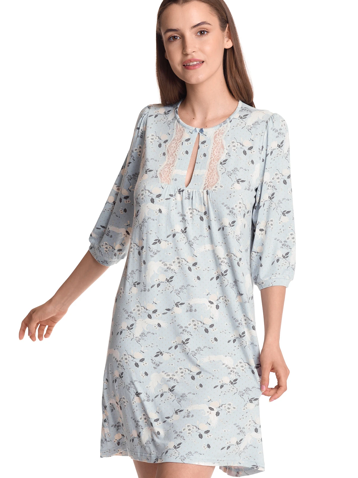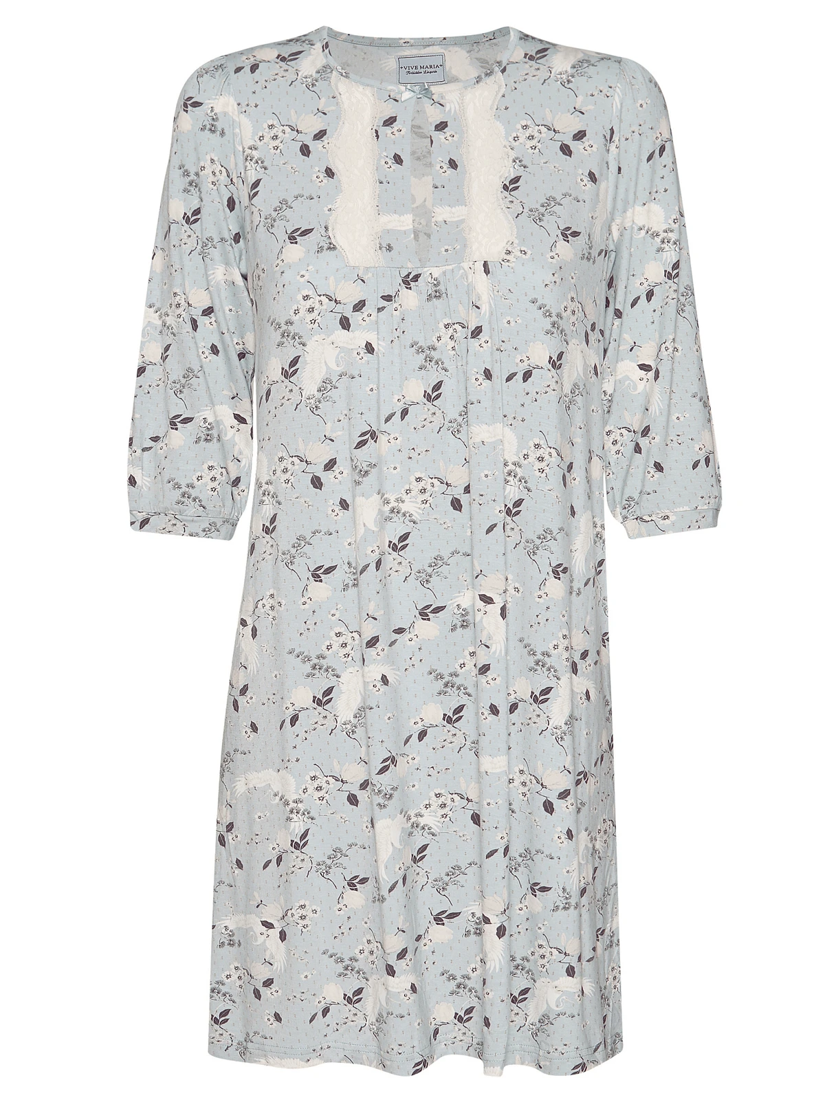 Blue Dawn mit Vive Maria Das traumhaft schöne Vive Maria Nachthemd ist aus einem angenehmen Viskosematerial mit Elasthananteil. Die eingesetzte Spitze ist aus einem Polyester-Elasthan-Gemisch. Es ist in sanfter A-Linie geschnitten und hat 3/4 lange Arme, die mit einer schmalen Stoffblende abgeschlossen sind. Der runde Halsausschnitt ist mit einem Einfassband abgeschlossen, dass vorne mit einer kleinen Satinschleife verziert ist. Ein kleines, langezogenes Guckloch ziert den Brustbereich. Der Druck zeigt cremefarbene Blumen und Kraniche auf hellblauem Stoff. Länge in Gr. S ca. 89 cm