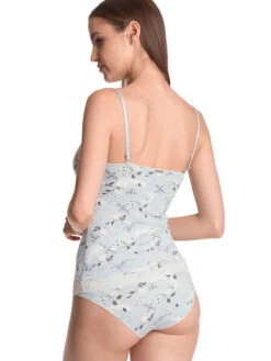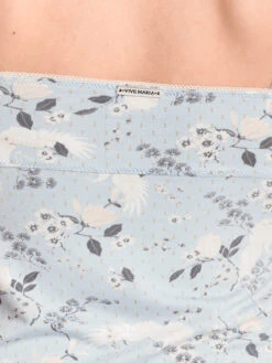Blue Dawn mit Vive Maria Das Vive Maria Wäscheset besteht aus einem Ober- und Unterteil. Es ist aus einem angenehmen Viskosematerial mit Elasthananteil. Die eingesetzte Spitze ist aus einem Polyester-Elasthan-Gemisch. Der Druck zeigt cremefarbene Blumen und Kraniche auf hellblauem Stoff. Das Oberteil ist figurbetont geschnitten und hat dünne, verstellbare Träger. Der tiefliegende Ausschnitt ist mit einer transparenten Spitzenbordüre abgeschlossen. Eine Unterbrustnaht, ein Metallanhänger und eine Satinschleife zieren den Brustbereich und sorgen für einen guten Sitz. Der untere Saum ist ebenfalls mit transparenter Spitze abgeschlossen. Länge in Gr. S ohne Träger ca. 41 cm Die Panty hat einen Satingummibund, der mit einer Rose und einem Metallanhänger verziert ist. Transparente Spitze ist im vorderen Bereich eingesetzt. Die Hosenbeine werden mit einem Rüschengummi abgeschlossen. Vordere Länge bis Zwickelnaht ca. 23 cm.