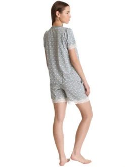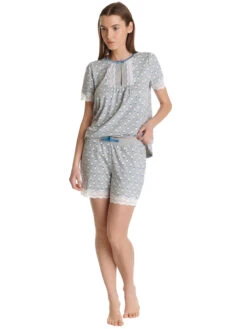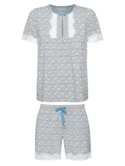 – süßer Kurzpyjama bestehend aus einem Oberteil und einer Hose. Geblümter grauer Stoff aus Baumwolle, Modal und Elsathan. Spitzeneinsätze aus Polyamid und Elasthan. – Das Oberteil hat eine lockere Passform und kurze Arme, die mit einer Spitzenbordüre abgeschlossen werden – runder Halsausschnitt mit Einfassband und blauer Satinschleife – Verzierungen mit Spitze und kleinem Guckloch – Länge in Gr. S ca. 60 cm – kurze Pyjamahose mit breitem Gummibund und Bindeband – seitliche Eingrifftaschen – Spitzenbordüre als Beinabschluss – Innenbeinlänge in Gr. S ca. 13 cm