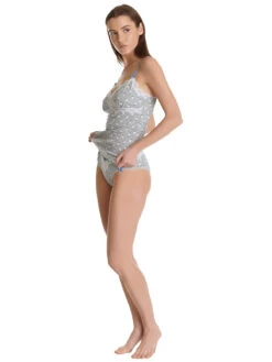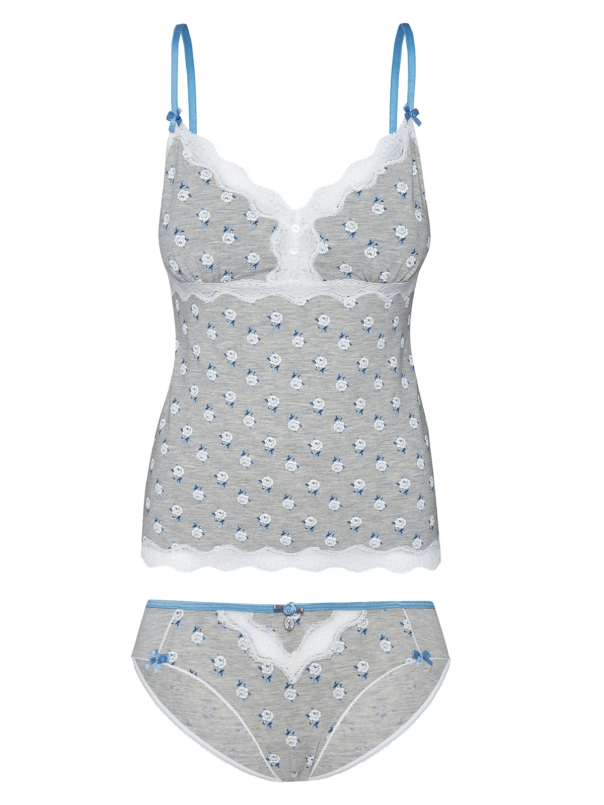 – romantisches Wäscheset, bestehend aus Hemdchen und Höschen mit einem süßen Blumenprint auf grauem Stoff, der aus einem grauen geblümten Stoff besteht. Die Spitze ist aus einem Polyamid-Elasthan-Gemisch – figurbetontes Hemdchen mit dünnen, verstellbaren Trägern und blauen Satinschleifen – transparenter Spitzeneinsatz und Zierknöpfe im Brustbereich und als Saumabschluss – Länge ohne Träger in Gr. S ca. 44 cm – blauer Satingrummibund mit Satinrose und Metallanhänger als Verzierung – Litze und Satinschliefen am Beinabschluss – Einsatz von Spitze im vorderen Bereich – Vordere Länge bis Zwickelnaht ca. 23 cm