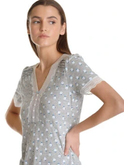 – Vive Maria Nachthemd aus einem angenehmen Baumwoll-Modal-Gemisch mit Elasthananteil. Spitzeneinsätze aus Polyamid und Elasthan. Der Stoff zeigt einen romantischen Blumenprint auf grauem Stoff – gerade geschnittene Passform – kurze Arme mit transparenter SpitzenbordĂĽre – Ausschnitt mit SpitzenbordĂĽre, Zierknöfen und Satinschleife – Biesen im vorderen Schulterbereich Länge in Gr. S ca. 90 cm