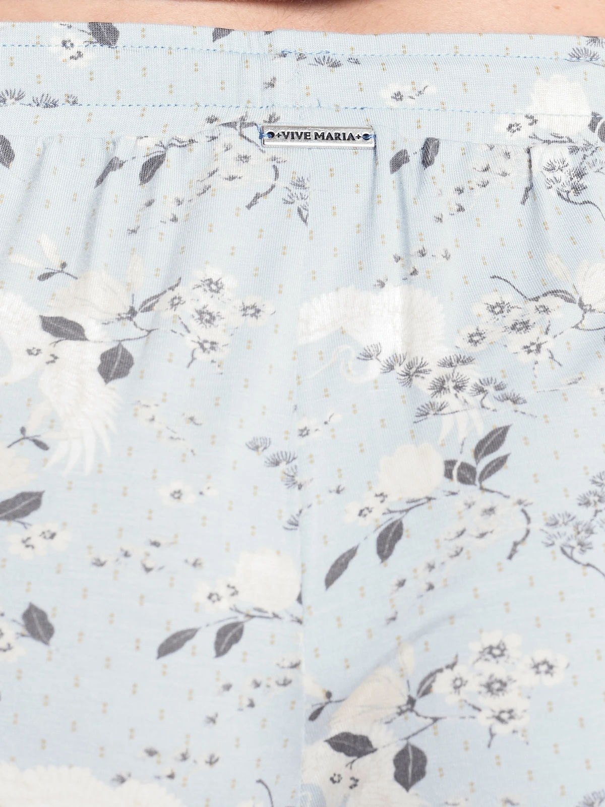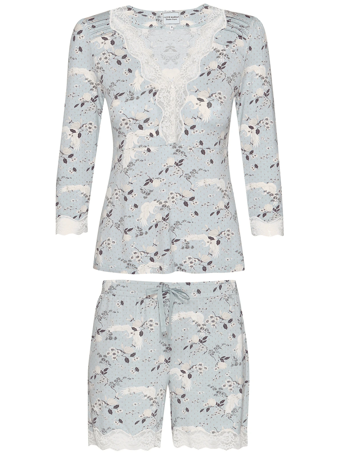 Blue Sky Pyjama mit Vive Maria Der süße Vive Maria Pyjama ist aus einem angenehmen Viskosematerial mit Elasthananteil. Die eingesetzte Spitze ist aus einem Polyester-Elasthan-Gemisch. Der Druck zeigt cremefarbene Blumen sowie Kraniche auf hellblauem Stoff. Der Pyjama besteht aus zwei Teilen. Das Oberteil ist figurnah geschnitten und hat 3/4 lange Arme, die mit einer schmalen Spitzenbordüre abgeschlossen werden. Der tiefe V-Ausschnitt sowie die angesetzte Zierknopfleiste ist ebenfalls mit Spitze hinterlegt. Eine Unterbrustnaht sorgt für einen guten Sitz. Länge in Gr. S ca. 59 cm Die Pyjamahose hat einen breiten Gummibund mit eingezogenen Bindeband, dass für eine zusätzliche Weitenregulierung sorgt. Seitliche Eingrifftaschen sorgen für einen bequemen Sitz. Die kurzen Hosenbeine werden mit einer transparenten Spitzenbordüre abgeschlossen. Innenbeinlänge in Gr. S ca. 13 cm