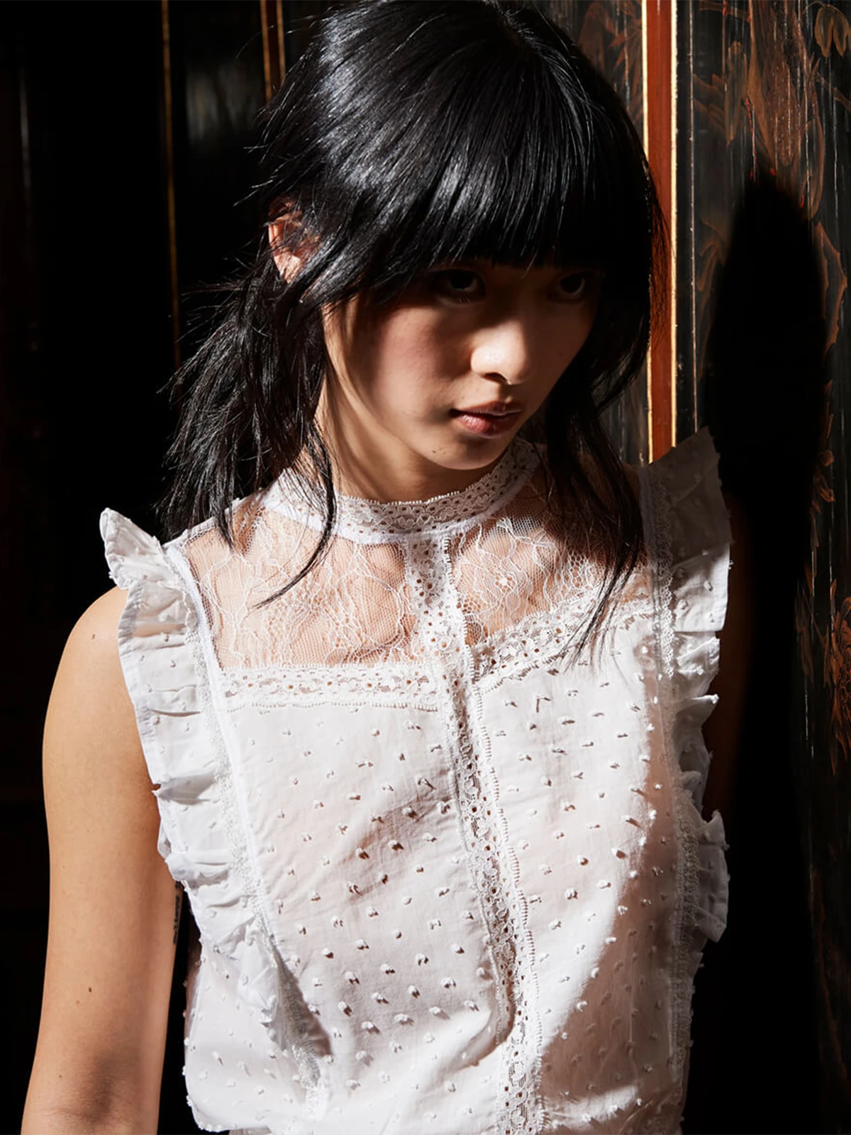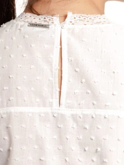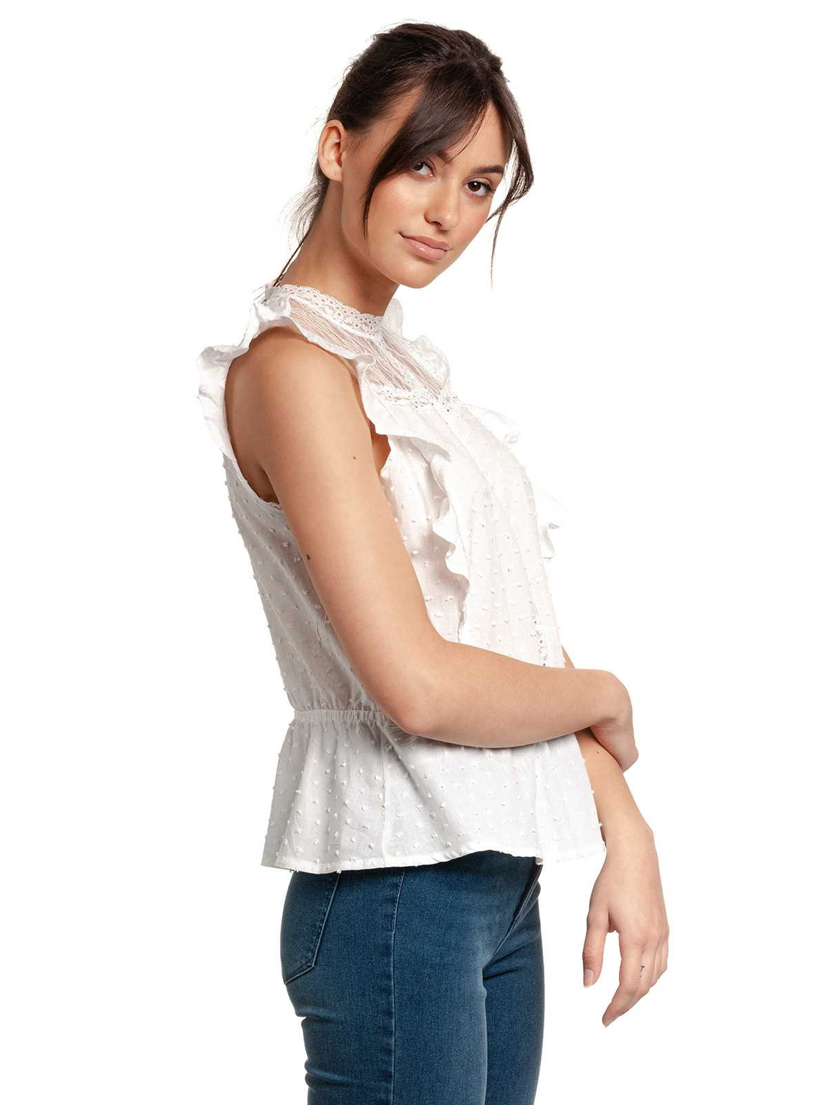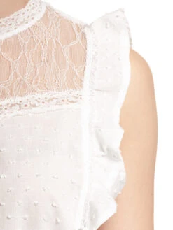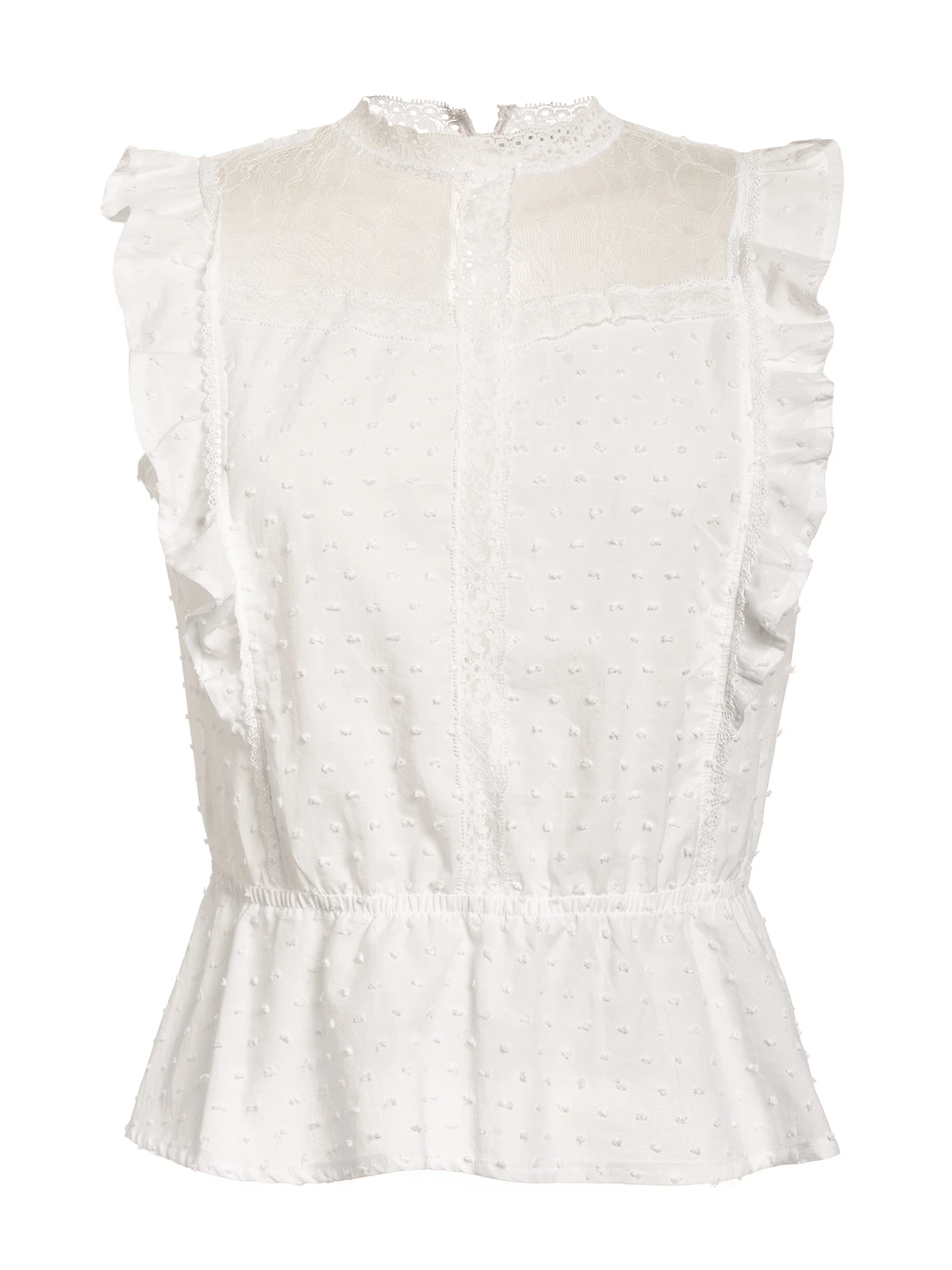 Das traumhaft schöne Vive Maria Top ist aus einem angenehmen Baumwollmaterial. Es ist gerade geschnitten und hat einen Gummizug in Taillenhöhe. Der kleine Stehkragen, sowie der vordere Schulterbereich sind aus transparenter Spitze. Der Kragen wird im Nacken mit einem Knopf und einem Gummizug geschlossen, so dass ein Guckloch entsteht. Seitlich angebrachter Volant zeiht sich ĂĽber das komplette Oberteil und bildet die Ă„rmel des Tops. Der Stoff ist aus Baumwolle Voile und hat kleine PĂĽnktchen. Der Baumwollstoff ist nicht dehnbar, wodurch eine lockere Passform entsteht. Es ist kurz geschnitten und leicht durchscheinend. Ein wunderschönes Sommertop, das sofort Lust auf Urlaub macht. das ‚Boho Love Lacetop‘ ĂĽberzeug mit sommerlicher Leichtigkeit und passt hervorragend zu Jeans und einem Blazer. Ein paar Wedges runden das Gesamtbild ab.