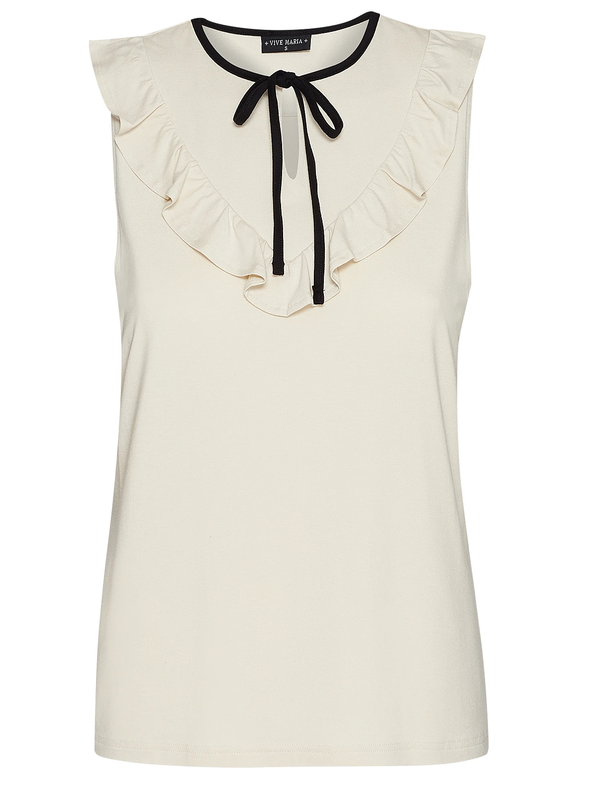 Das sĂĽĂźe Vive Maria Top ist aus einem weichen Viskosematerial mit Elasthananteil. Es ist figurbeont geschnitten und hat einen hochgeschlossenen runden Halsausschnitt, der mit einem schwarzen Einfassband abgeschlossen wird. Dieses wird vorne zu einer Schleife gebunden, so dass eine kleine V-förmige Ă–ffnung entsteht. Ein aufgenähter Volant, ebenfalls in V-Form bildet das Highlight des Tops. Das Top ist einfarbig und cremefarben. Das ‚Cappucine Creme Top‘ ist ein toller Begleiter fĂĽr den Arbeitsalltag und macht sich hervorragend mit einer Stoffhose im Office. Falls es etwas kĂĽhler ist passt ein Blazer hervorragend dazu. Eine tolle ALternative ist das ‚Cappucine black Top‘.