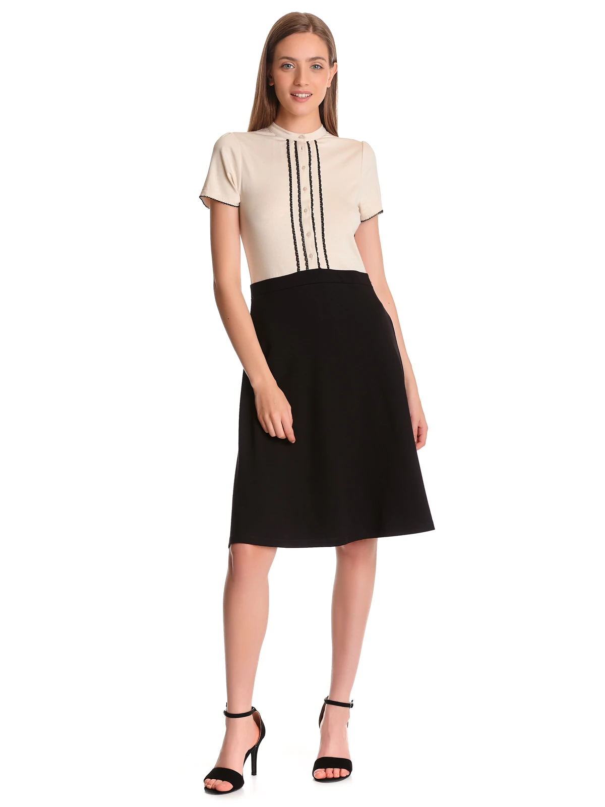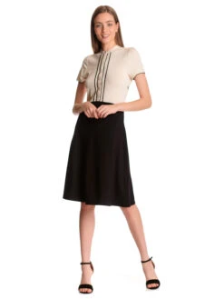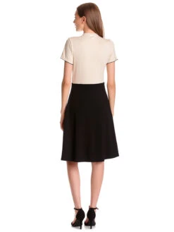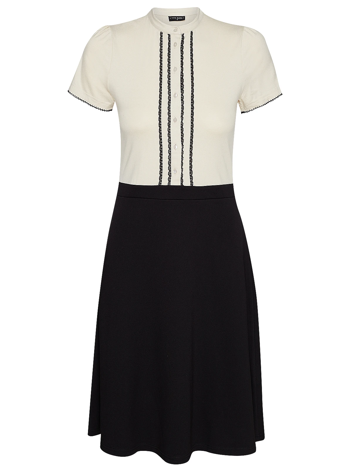 Das traumhaft schöne Vive Maria Kleid ist aus einem angenehmen Materialmix. Das cremefarbene Oberteil ist aus weicher Viskose mit einem hauch Elasthan, der schwarze Rockteil ist aus einem Viskose-Polyamid-Elasthangemisch. Es ist in leicht A-Linie geschnitten und fällt locker um die Beine. Das Kleid hat kurze Arme, die mit einer angehäkelten Litze abgeschlossen werden. Der runde Halsausschnitt schließt mit einem verkürzen kleinen Stehkragen ab. Eine Knopfleiste wird von zwei Spitzennähten gesäumt. Ein Teilungsgürtel in Taillenhöhe trennt Ober- und Unterteil optisch voneinander. Ein absoluter Klassiker, der sowohl ins Büro als auch zum großen Familienfest passt. Das ‚Cappucine Day Dress‘ überuzeugt mit schlichter Eleganz und kann perfekt mit klassichen Pumps kombiniert werden.