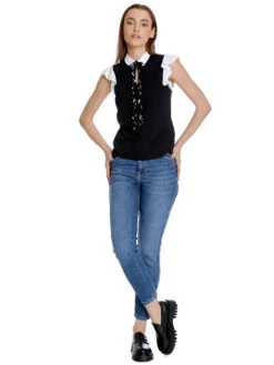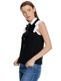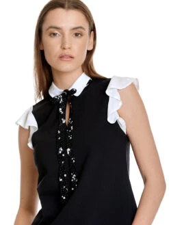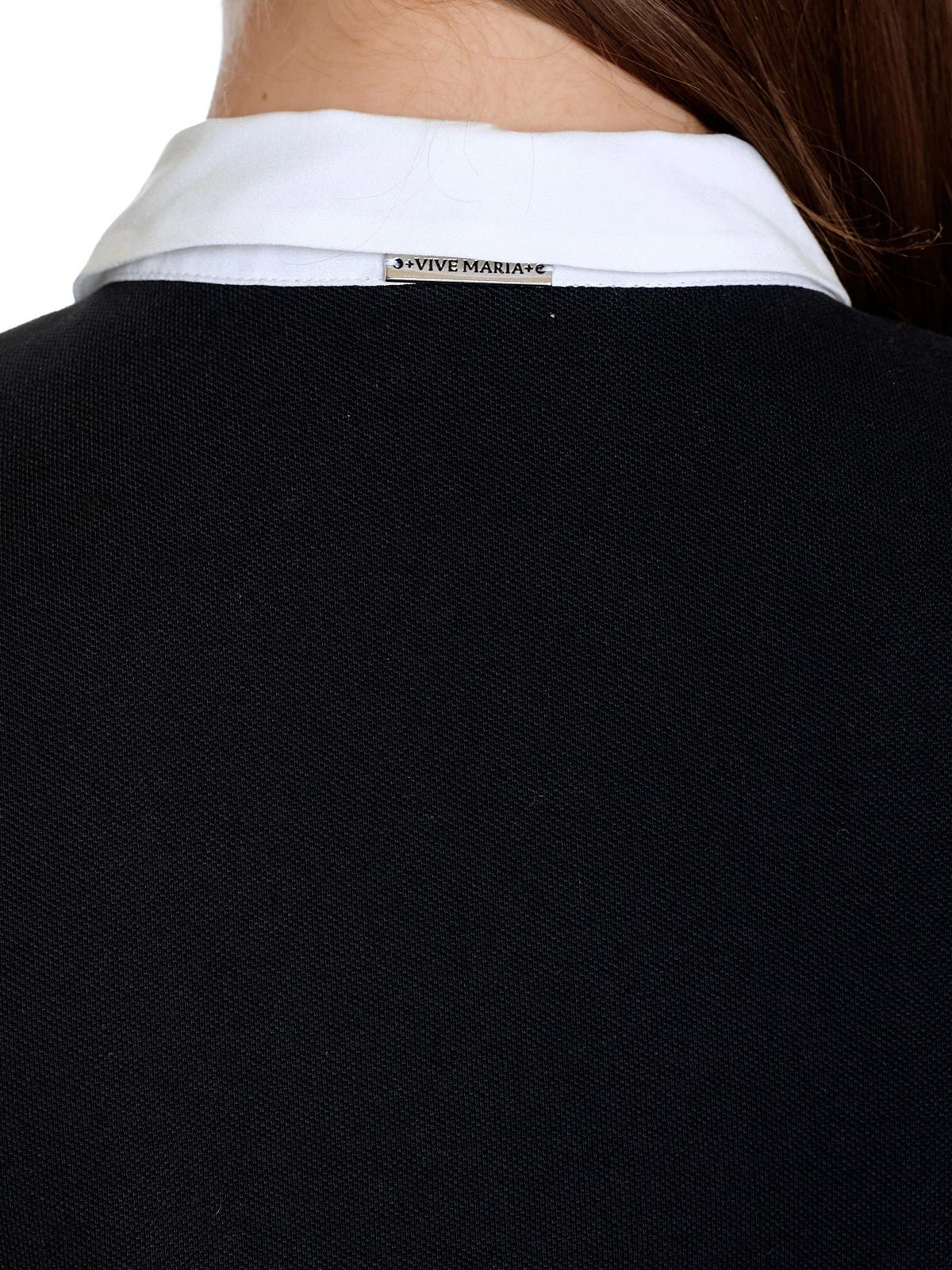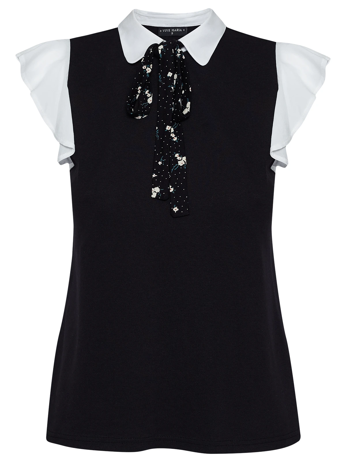 Das süße Vive Maria Blusenshirt ist aus einem angenehmen Baumwoll-Polyester-Gemisch, die Ärmel, sowie die Blusenkragen sind aus Viskose, das Bindeband ist ein Viskose-Elasthan-Gemisch – gerade Passform, fester Stoff – Angesetzer Volant bilder die Ärmel – runder Halsausschnitt mit Knopfschließe vorne – Kontrastblusenkragen – Bindband mit süßem Blumenprint – unifarben schwarz mit hellen Kontrastelementen Länge in Gr. S ca. 56 cm
