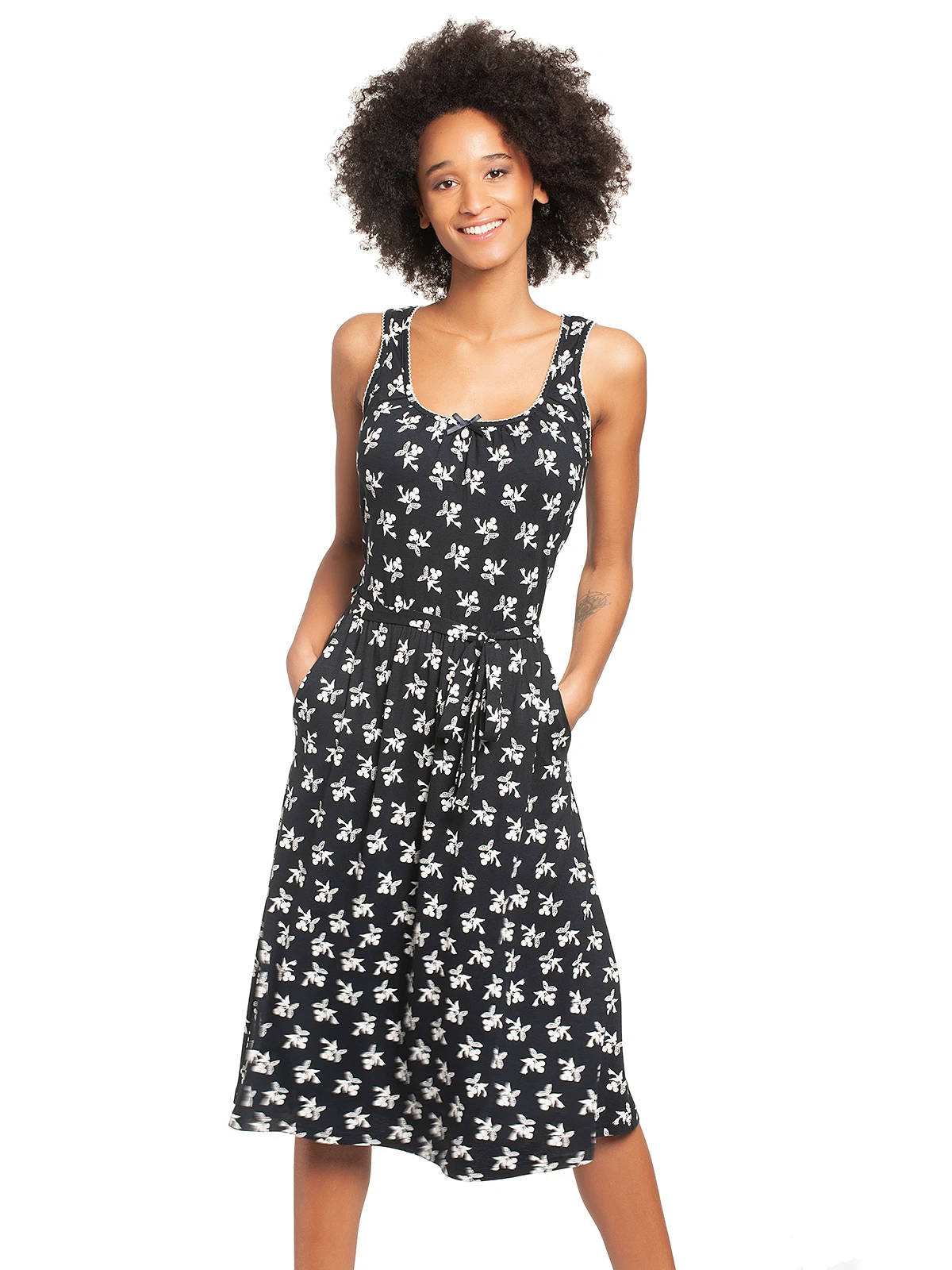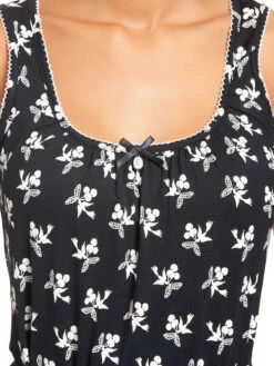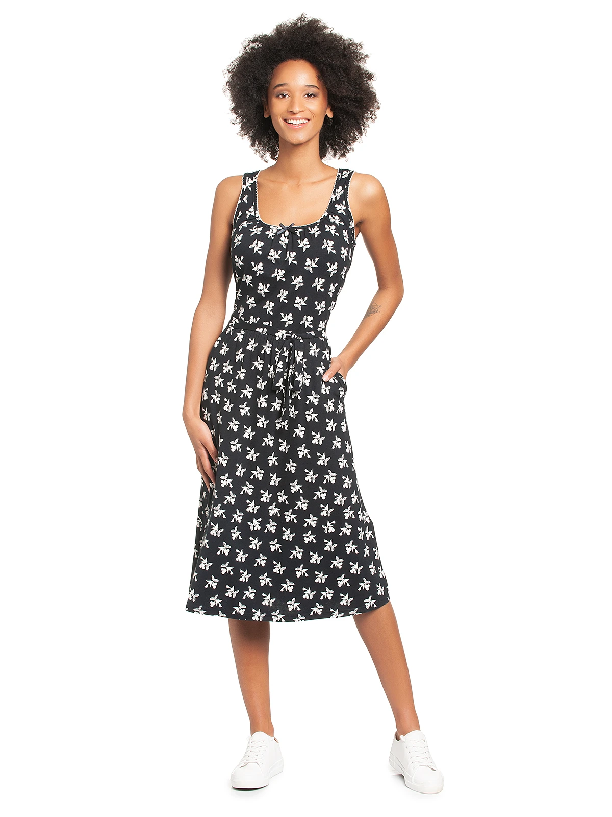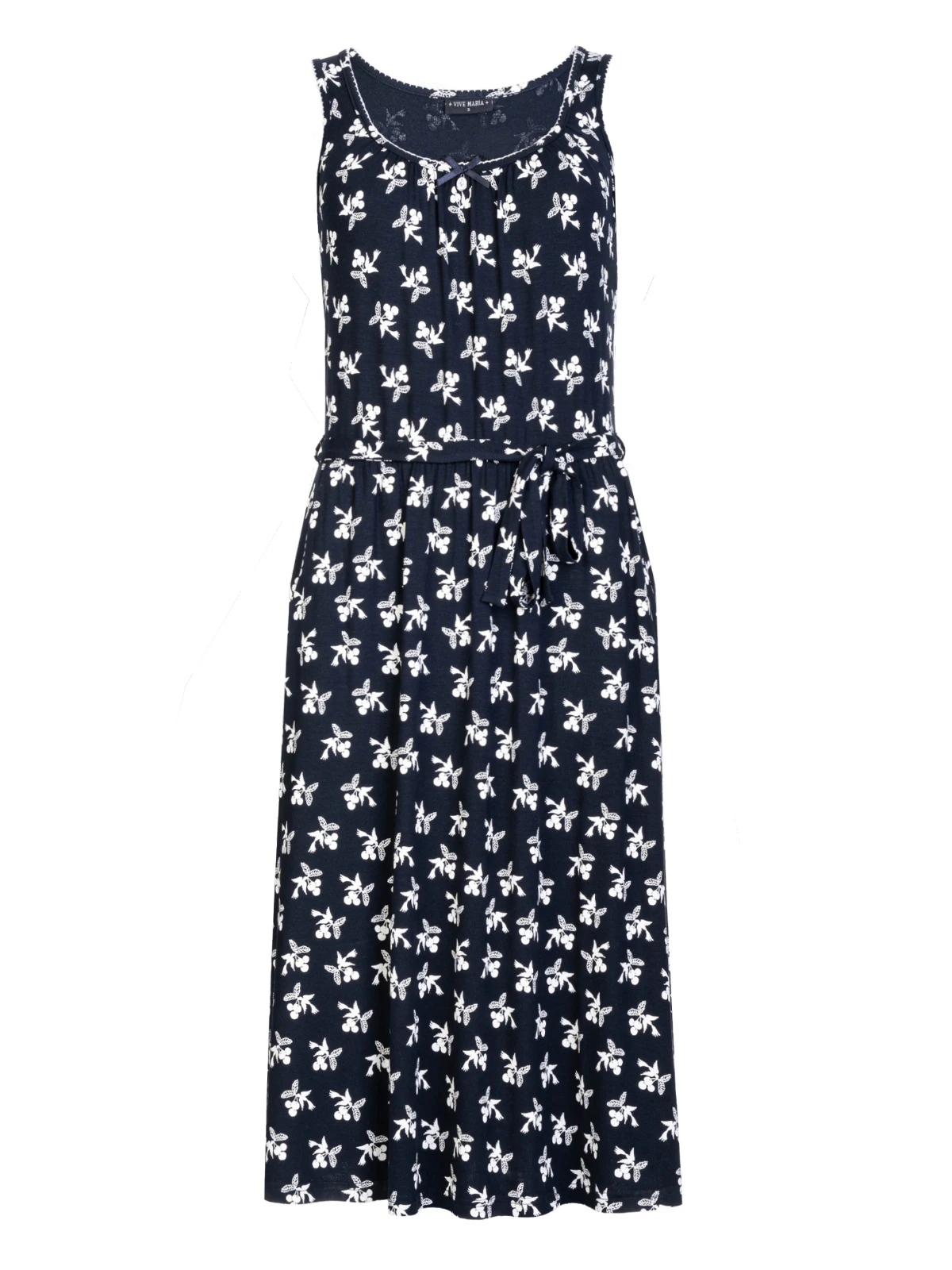 Das wunderschöne Vive Maria Freizeitkleid ist aus einem leichten Viskosematerial mit Elasthananteil. Es ist in A-Linie geschnitten und hat breite Träger. Diese werden, so wie auch der runde Halsausschnitt mit einer Litze verziert und abgeschlossen. Eine kleine Satinschleife und ein Metallanhänger bilden das Highlight des Ausschnitts. Ein eingearbeiteter Gummi auf Taillenhöhe wird mit einem GĂĽrtel in Stofffarbe verdeckt. Seitliche Eingrifftaschen machen das Kleid besonders bequem und sorgen fĂĽr eine lässige Optik. Der Rockteil fällt leicht ausgestellt und angenehm um die Beine. Der Druck zeigt kleine Schwalben, die einen Bund Kirschen im Schnabel halten. Das ‚Cherry Summer Dress‘ hat einen einzigartigen Schnitt und ĂĽberzeugt mit absoluter leichtigkeit. Der 50s Druck gefällt sicher nicht nur Vintageladys und es passt hervorragend zu Sneakern oder natĂĽrlich, ganz klassisch, zu Pumps.