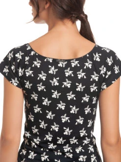 Das extravagante Vive Maria Shirt ist aus einem leichten Viskosematerial mit Elasthananteil. Es ist figurbetont geschnitten und hat kurze Arme, die mit einem T-Shirtsaum abgeschlossen werden. Der tiefe V-Ausschnitt ist mit einer dunklen Litze verziert und wird auf Dekolleteehöhe mit zwei Bändern verknotet. Dadurch entsteht unterhalb ein kleines Guckloch. Eine Unterbrustnaht, ebenfalls aus einer Litze bestehend, sorgt für einen guten Sitz. Das Shirt hat einen tollen 50er Jahre Druck und zeigt helle Schwalben, die drei kleine Kirschen im Schnabel halten. Das sexy ‚Cherry Summer Shirt‘ ist absolut typisch für Vive Maria und ein absolutes Muss für alle Vintage-Ladys. Kombiniert werden kann es mit einem Pencil Skirt und Peeptoes.