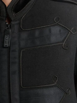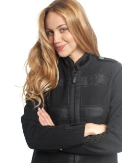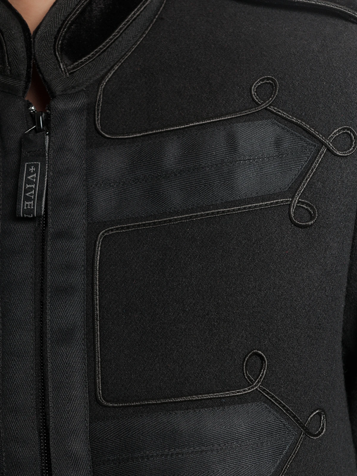 Dieser wunderschöne schwarze Mantel ist wie bereits sein Name sagt schick und klassisch. Er ĂĽberzeugt durch seine Liebe zum Detail, denn es gibt viele Kleinigkeiten, die den Mantel so besonders machen. Der Grundschnitt ist im Militär-Stil gehalten, das Krageninnere, sowie ein Einsatz auf der KragenauĂźenseite, die Schulterpatten und ein Einsatz am Ă„rmelabschluss sind aus Samt, was ihn sofort hochwertig aussehen lässt. Die Schulterpatten sind mit einem Vive Maria Knopf befestigt, in dem eine Krone eingearbeitet ist. Der mittige ReiĂźverschluss wird von einem breiten Band verdeckt. Aus dem gleichen Band sind auch weitere Verziehrungen, sowie zwei Taschen auf dem Mantel angebracht. All diese Verziehrungen werden von einer Satinkordel eingefasst, die kleine Schnörkel drumherum bilden und dem Mantel so feminin wirken lassen. Kleine Schlitze an den Seiten sorgen dafĂĽr, dass er, trotz seiner schmalen Passform, bequem sitzt. Auf dem RĂĽcken gibt es neben der mittigen Teilungsnaht eine Prinzess- oder Wiener Naht, die auch von hinten fĂĽr eine schlanke Silhouette sorgt. Alles in allem ist dieser Mantel so Besonders und Einzigartig, dass man ihn gar nicht mehr ausziehen möchte.Â