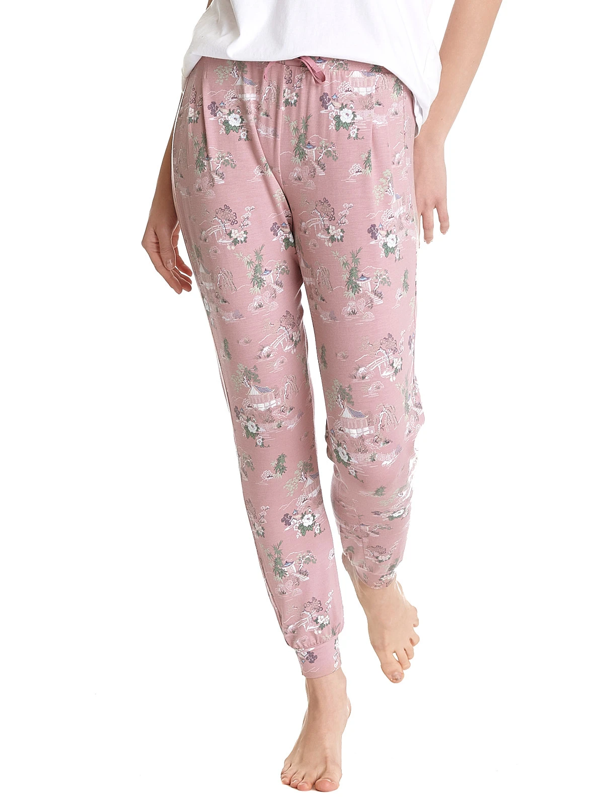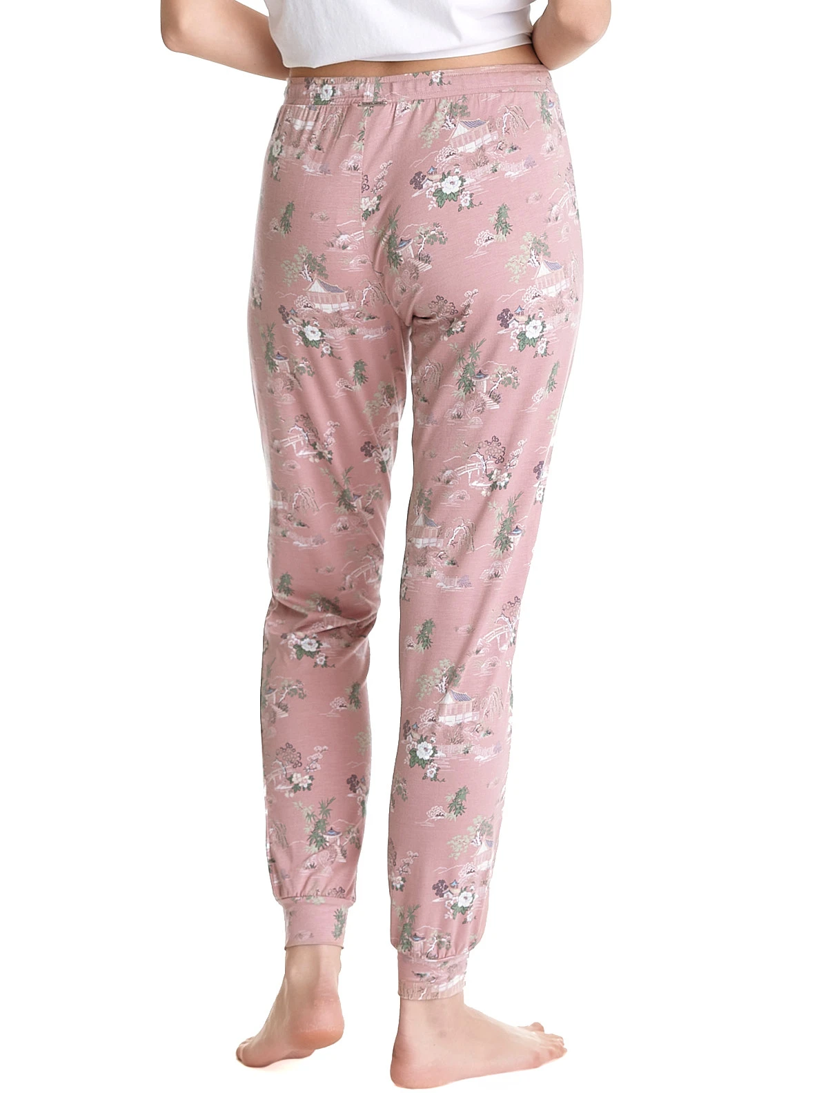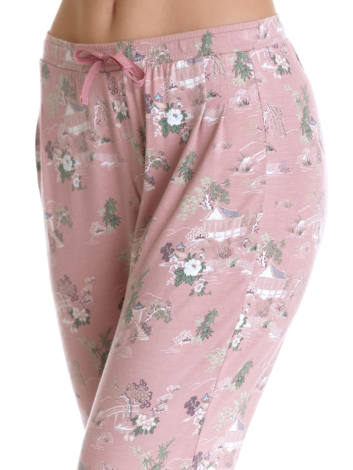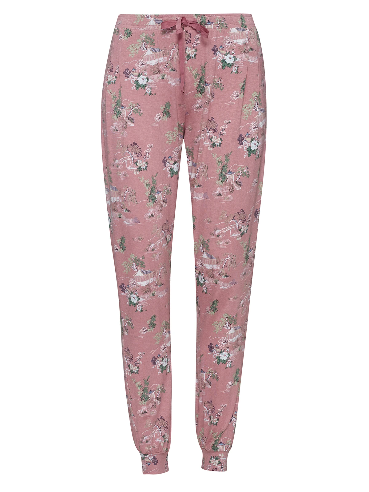 Vive Maria Pyjamapants aus Viskose mit Elasthananteil, asiatischer Print auf rosafarbenem Stoff – lange, schmal geschnittene Pants mit reitem BĂĽndchen als Beinabschluss – breiter Gummibund fĂĽr hohen Tragekomfort mit zusätzlichem Bindeband Innenbeinlänge in Gr. S ca. 75 cm