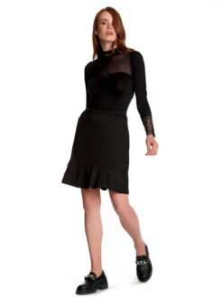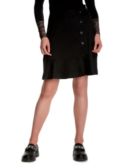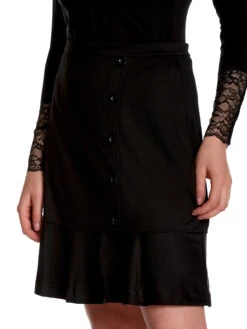 Der traumhaft schöne Vive Maria Rock ist aus einem angenehmen Materialmix aus Viskose, Polyester und Elasthan. Das Futter ist aus Polyester. Der Rock sitzt eng und verläuft in einer leichten A-Linie. Er hat einen schmalen Bund, der hinten mit einem versteckten Reißverschluss geschlossen wird. Eine seitliche Ziernaht und Zierknöpfe schmücken den vorderen Bereich. ein angesetzter Volant verleiht dem Rock einen lockeren Look. Der ‚Colette’s Day Skirt‘ ist absolut klassisch und kann so ziemlich mit allem kombiniert werden. Ob Bluse oder Shirt, Stiefel oder Boots. Hier kannst du garantiert nichts falsch machen.