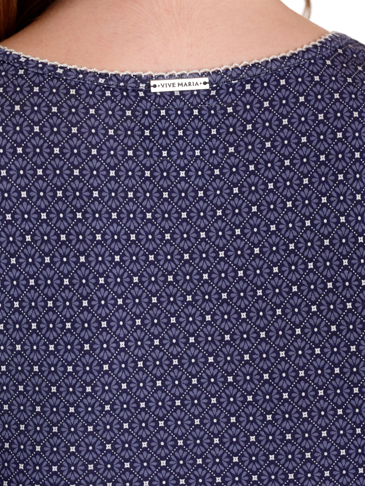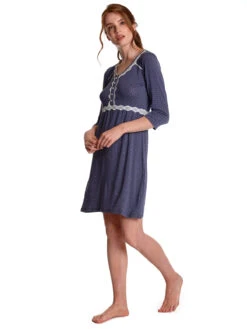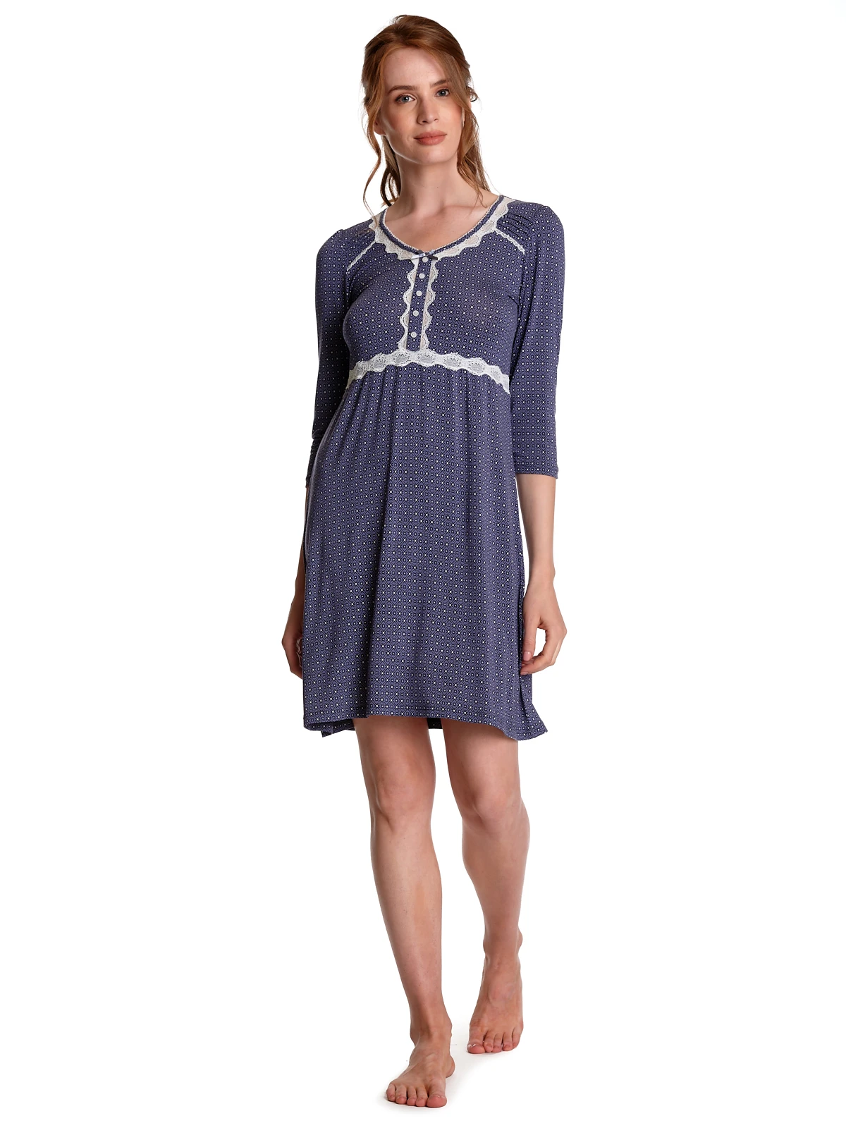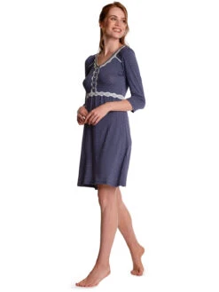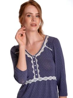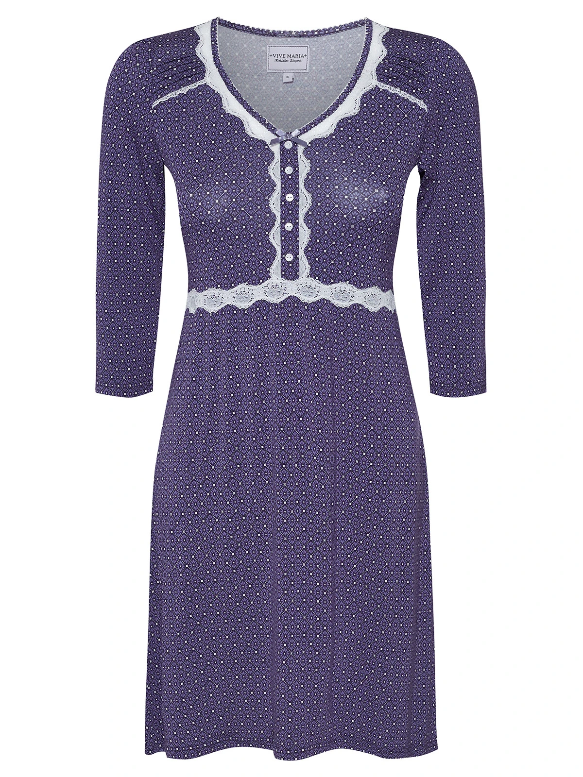 Das süße Vive Maria Nachthemd ist aus einem angenehmen Viskosematerial mit Elasthananteil. Es ist in leichter A-Linie geschnitten und hat halblange Arme. Der V-Ausschnitt ist mit einer Bordüre aus transparenter Spitze sowie einem Einfassband in Stofffarbe abgeschlossen. Genähte Biesen zieren die vordere Schulterpartie. Eine Zierknopfleiste wird ebenfalls von einer Spitzenbordüre verziert, die in eine Unterbrustnaht übergeht. Diese sorgt für einen guten Sitz. Das Muster zeigt kleinen Blumen in einer geometrischen Anordnung auf blauem Stoff.