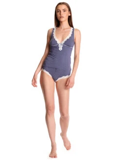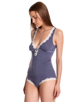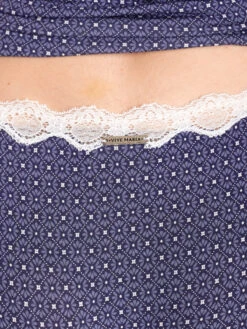 Das süße Vive Maria Wäscheset ist aus einem angenehmen Viskosematerial mit Elasthananteil und besteht aus zwei Teilen. Das Hemdchen ist figurbetont geschnitten, hat breite Träger und einen tiefen V-Ausschnitt, der mit einer Bordüre aus transparenter cremefarbener Spitze abgeschlossen werden. Der Dekolleteebereich ist mit drei kleinen Knöpfen sowie einer Satinschleife verziert. Die Armausschnitte sind mit einer cremefarbenen Litze abgeschlossen. Eine cremefarbene Litze dient als Unterbrustnaht und sorgt für einen guten Sitz. Der Print zeigt ein geometrisches Blumenmuster auf blauem Stoff. Das Pantyhöschen wird sowohl am oberen Bund als auch an den Beinausschnitten mit einer Bordüre aus transparenter cremefarbener Spitze abgeschlossen. Eine blaue Satinschleife sowie zwei kleine Knöpfe zieren den vorderen Bereich. Das Print zeigt ein geometrisches Blumenmuster auf blauem Stoff. Hemdchen Länge in Gr. S ca. 56 cm Panty vordere Länge in Gr. S ca. 14,5 cm