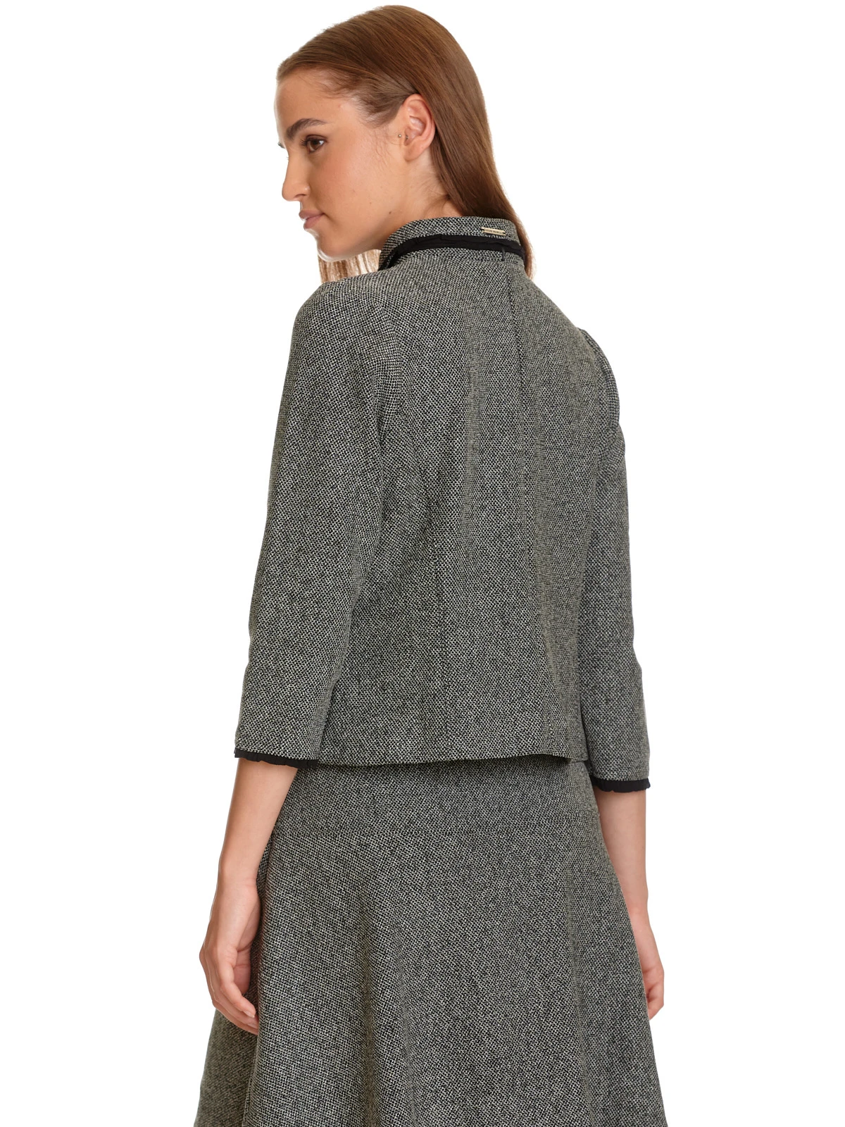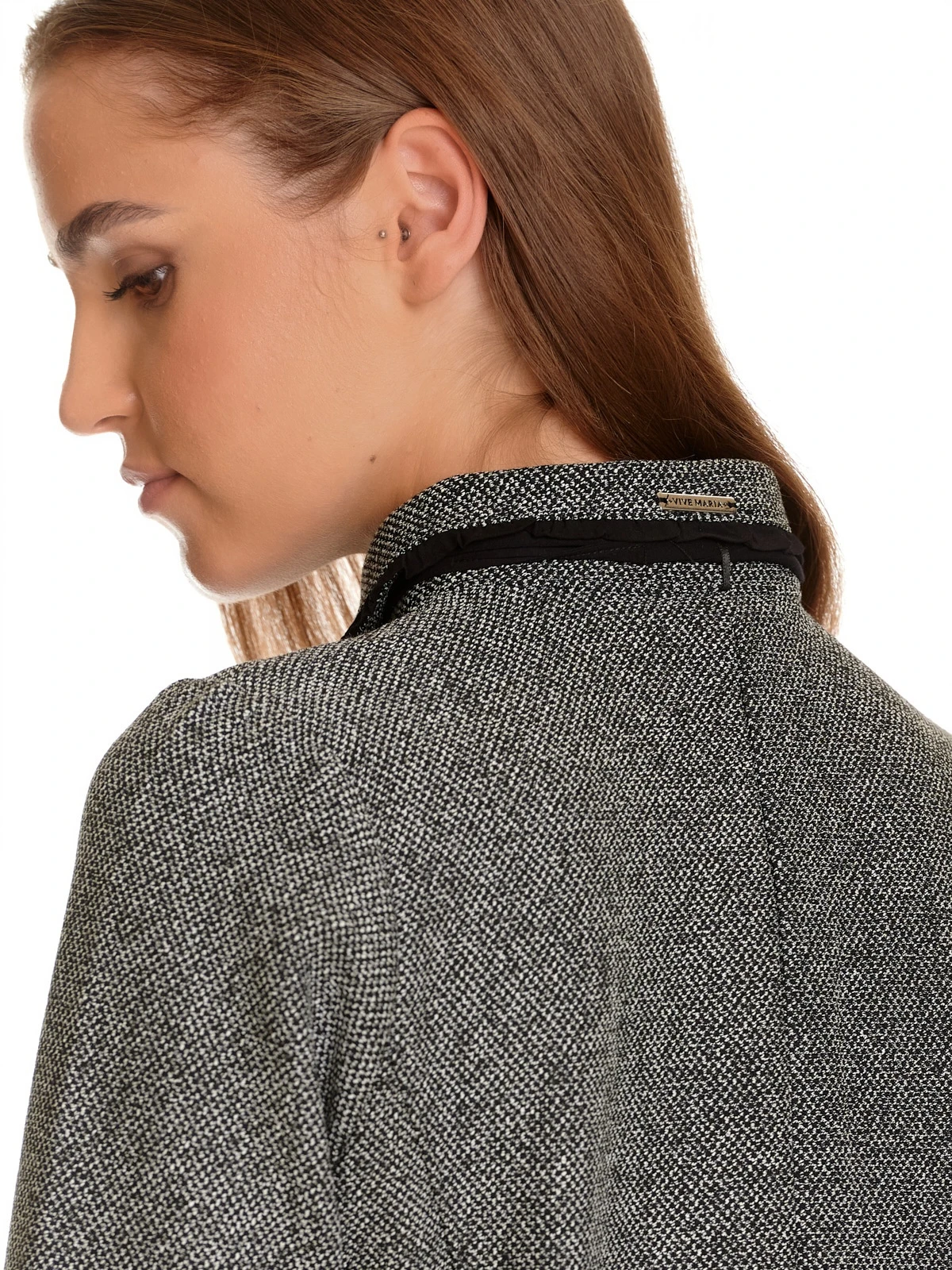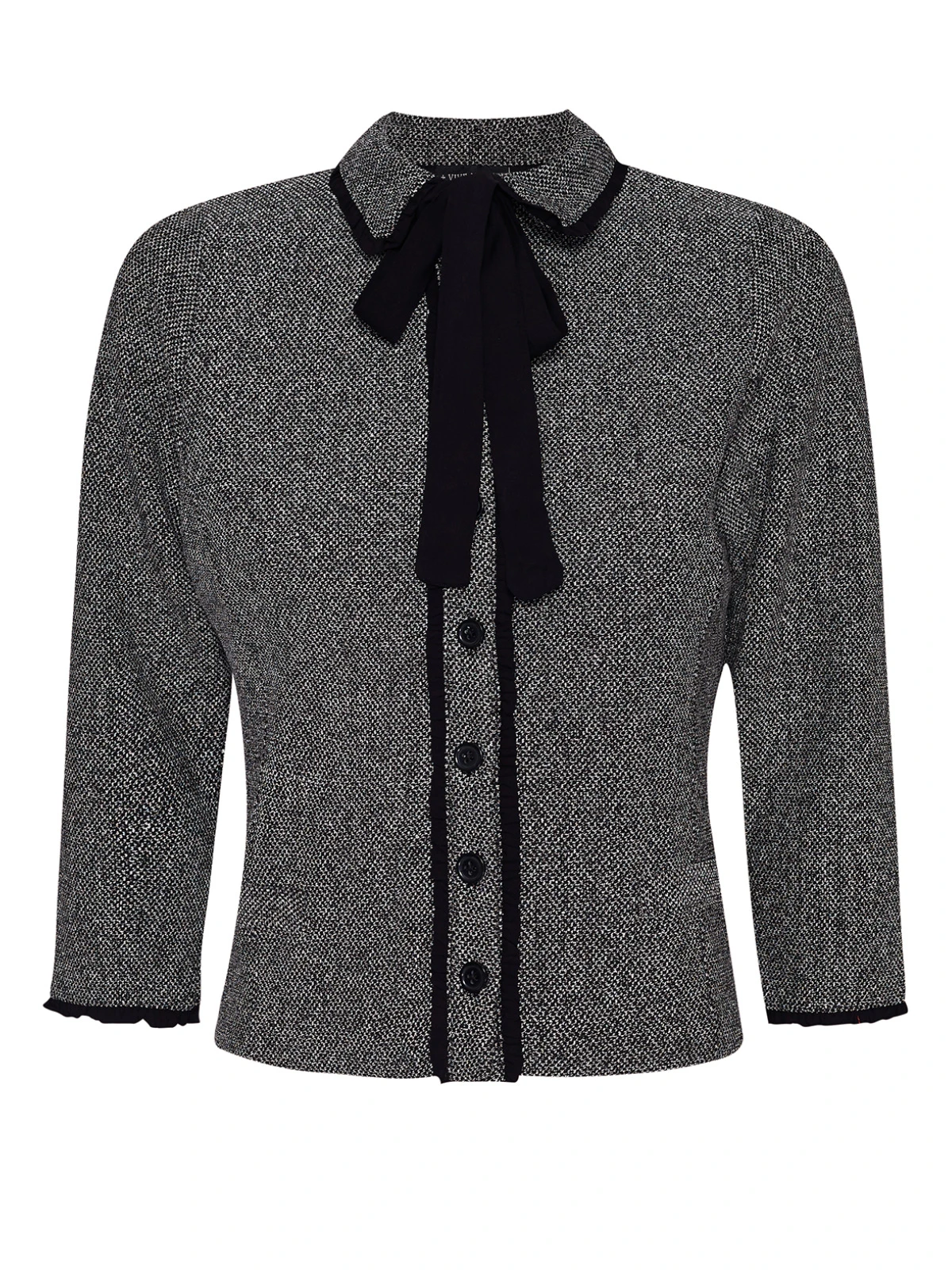 Die sĂĽĂźe Vive Maria Jacke ist aus einem angenehmen Polyestermatieral mit Viskose- und Elasthananteil. Das Innenfutter ist aus Baumwolle. Die Kurzjacke hat einen geraden Schnitt und 3/4 lange Arme, die mit einer schwarzen RĂĽsche abgeschlossen werden. Der Blusenkragen wird ebenfalls mit einer schwarzen RĂĽsche verziert. Ein Chiffon-Bindeband verläuft unter dem Kragen und wird vorne zu einer Schleife gebunden. Die durchgängige Knopfleiste ist von RĂĽschen gesäumt, zwei aufgesetzte Faketaschen lockern die Jacke optisch etwas auf. Die Jacke ist aus einem grau-melierten Tweed Jaquard mit einem schwarzen Innenfutter. Die ‚Cottage Girl‘ Jacke ist absolut sĂĽĂź zur restlichen ‚Cottage‘ Serie und unterstreicht den Uniform-Look.