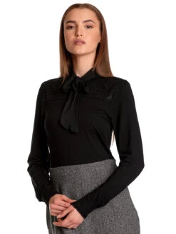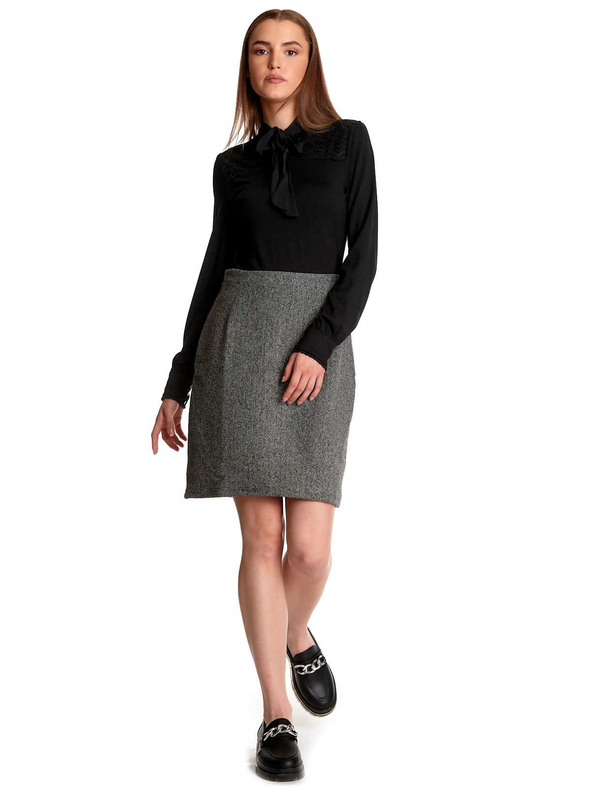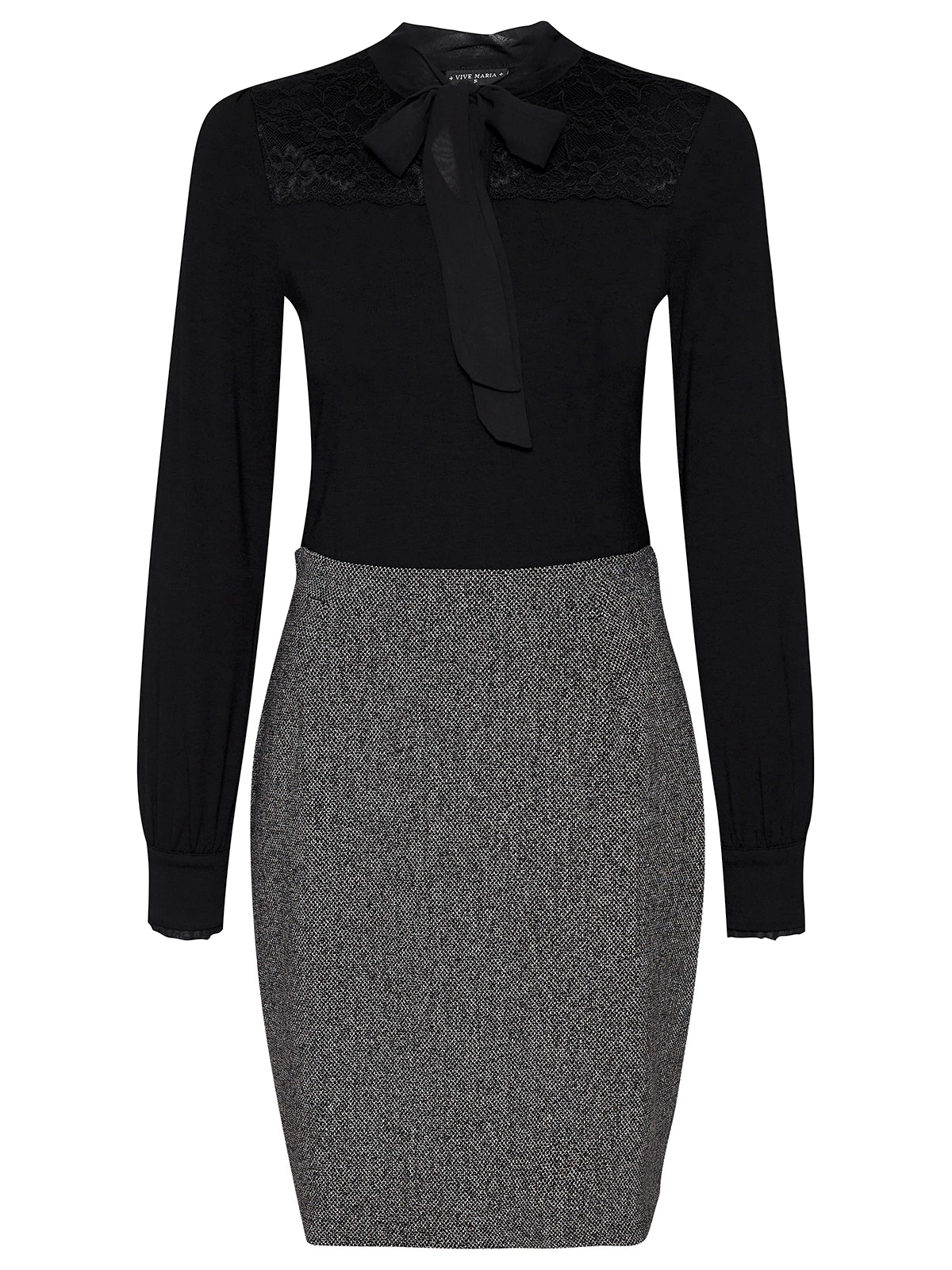 Das traumhaft schöne Vive Maria Kleid ist aus einem angenehmen Materialmix. Das unifarbene Oberteil ist aus einem Viskose, Elasthangemisch, der Rockteil aus Polyester mit Viskose und Elasthan, der Futterstoff im Rockteil ist aus Polyester. Das Kleid ist figurbetont und enganliegend geschnitten und hat lange Arme, die mit einer breiten Manschette abgeschlossen werden. Diese wird mit einer Rüsche aus Chiffonband verziert und wird mit Knöpfen und Gummischlaufen geschlossen. Der runde Halsausschnitt geht direkt in ein schwarzes Chiffonband über, dass vorne zu einer Schleife gebunden wird. Dadurch entsteht ein kleines Guckloch. Die vorderen Schulterpartien sind mit schwarzer Spitze überzogen. Der gefütterte Rockteil ist aus einem grau-melierten Tweed Jaquard und unterstreicht den Businessstyle. Das ‚Cottage Love Dress‘ ist ein toller Officebelgeiter und passt hervorragend zur scwharzen blickdichten Strumpfhose und Stiefeletten.