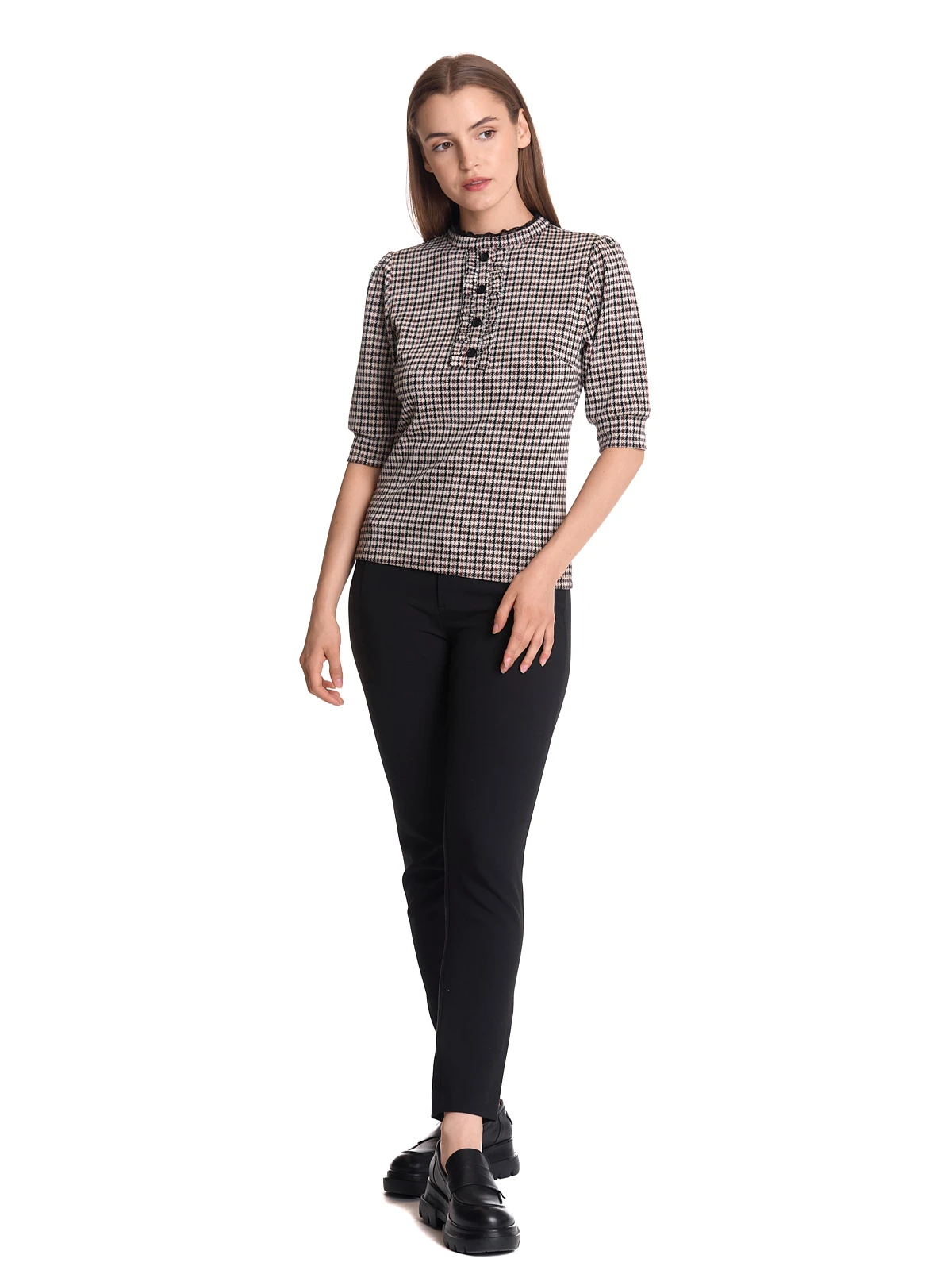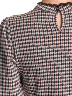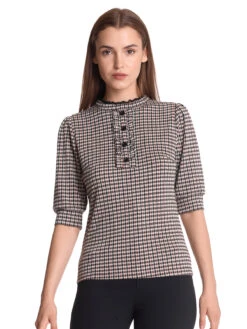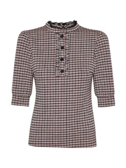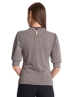 Dandy Day mit Vive Maria Das wunderschöne Vive Maria Oberteil ist aus einem angenehmen Polyestermaterial mit Viskose und Elsthananteil. Das muster zeigt einen in schwarz- und brauntönen gehaltenes Jaquardkaro auf cremefarbenem Stoff. Das Vive Maria Shirt ist figurbetont gschnitten und hat halblange Arme, die mit einer breiten Stoffblende abgeschlossen werden. Der runde Halsausschnitt geht direkt in einen kleinen Stehkragen ĂĽber, der mit einer schmalen SpitzenbordĂĽre abgeschlossen ist und im Nacken mit einem Knopf geschlossen wird. Eine Knopfleiste mit RĂĽsche ziert den vorderen Bereich. Das ‚Dandy Day‘ Shirt ist ein toller Alltagsbegleiter und ist perfekt fĂĽr den Tag im BĂĽro geeignet. Es passt sowohl zur Jeans und Blazer als auch zum hosenanzug. Länge in Gr. S ca. 56 cm.