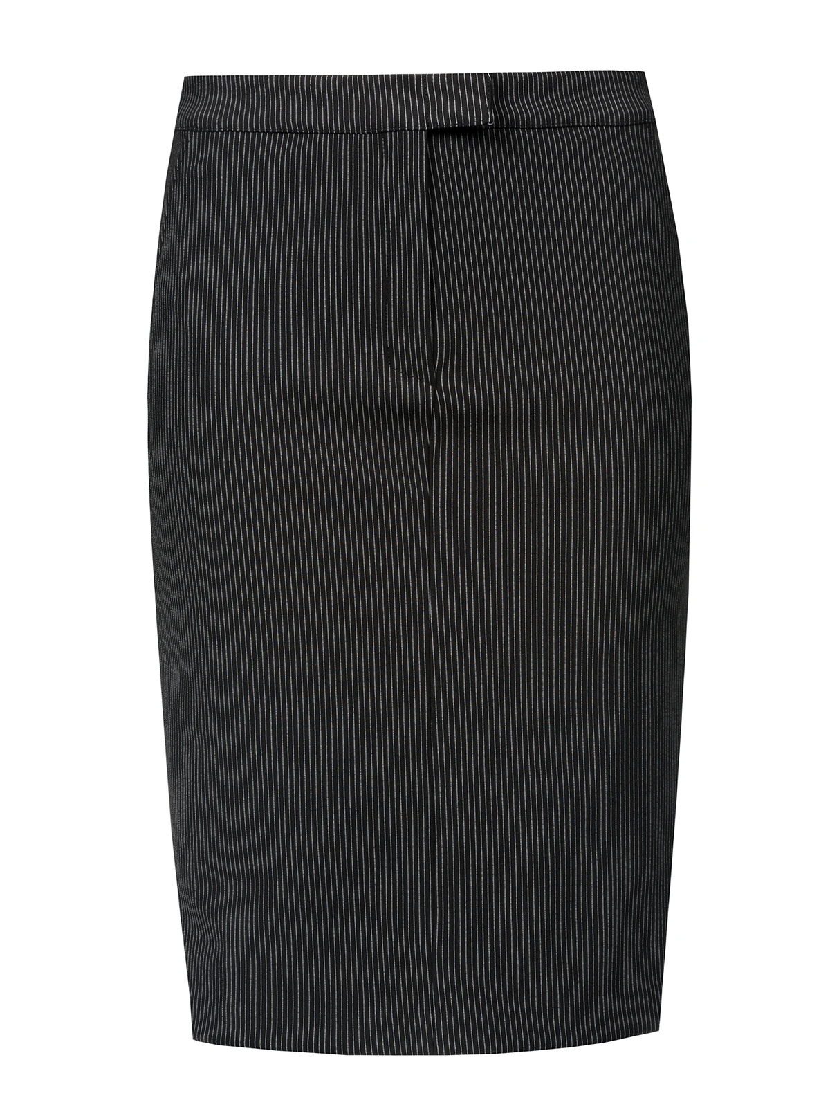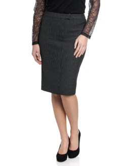 Der Dandy in Love Pencil Skirt besticht durch ein schwarzes Polyester-Viskose Material mit eingewebten Nadelstreifen.