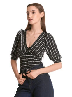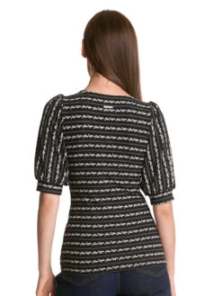 Dandy Stripes mit Vive Maria Das süße Vive Maria Shirt ist aus einem angenehmen Viskosematerial mit Elasthananteil. Es ist figurbetont geschnitten und hat halblange Arme, die mit eine Stoffblende abgeschlossen werden. Der tiefe V-Ausschnitt ist mit einer Satinschleife und einem Metallanhänger verziert. Eine geschwungene Unterbrustnaht sorgt für einen guten Sitz. Das Muster zeigt kleine, helle Blumenranken, die im Wechsel mit einem geometrischem Muster in waagerechten Linien angeordnet und auf schwarzem Stoff gedruckt ist Das ‚Dandy Stripes‘ Shirt von Vive Maria ist ein zauberhafter Alltagsbegleiter und passt hervorragend zur Bluejeans, Boots und einem Blazer. Dezenter Schmuck unterstreicht den schönen Look. Länge in Gr. S ca. 59 cm.
