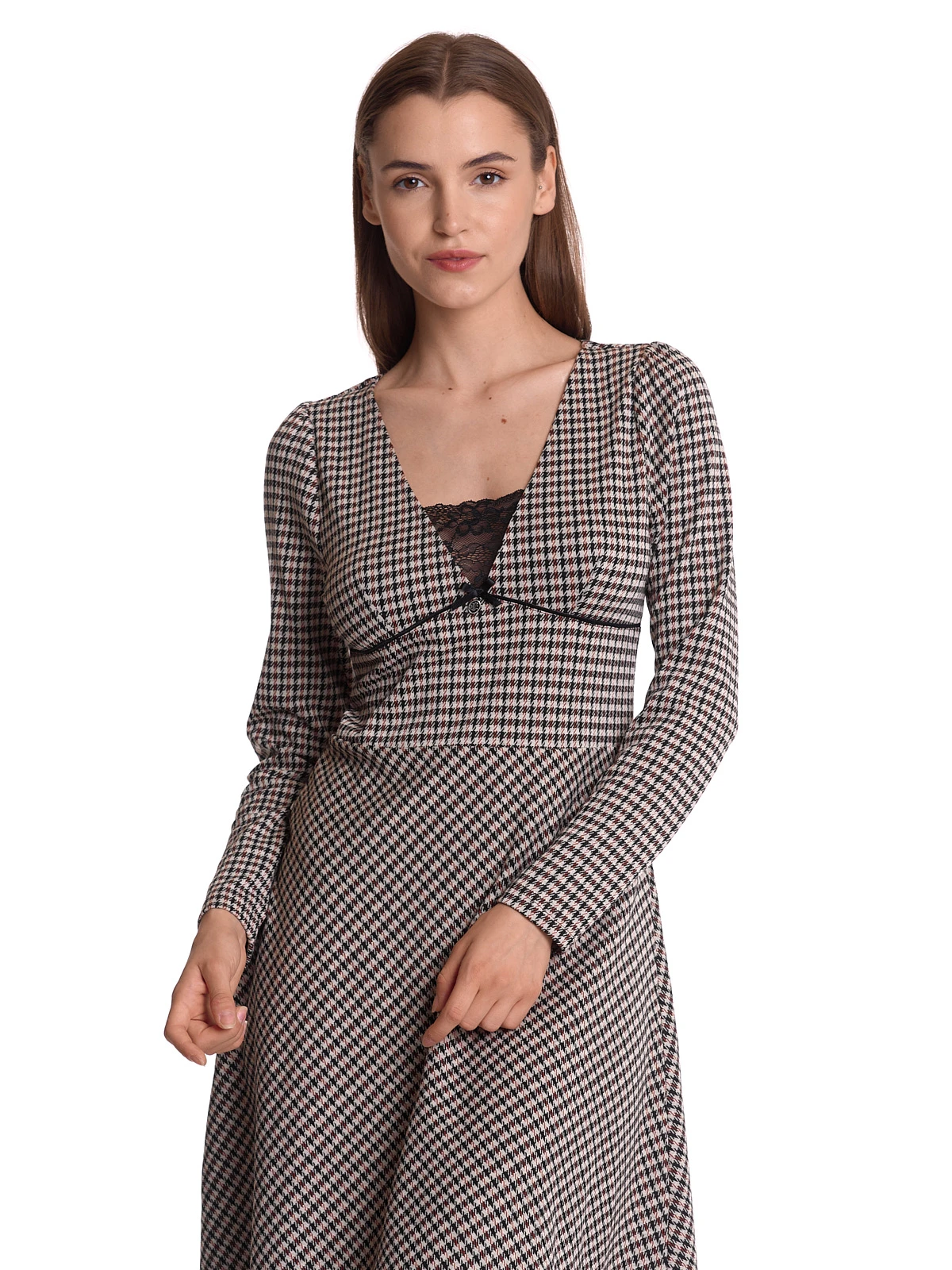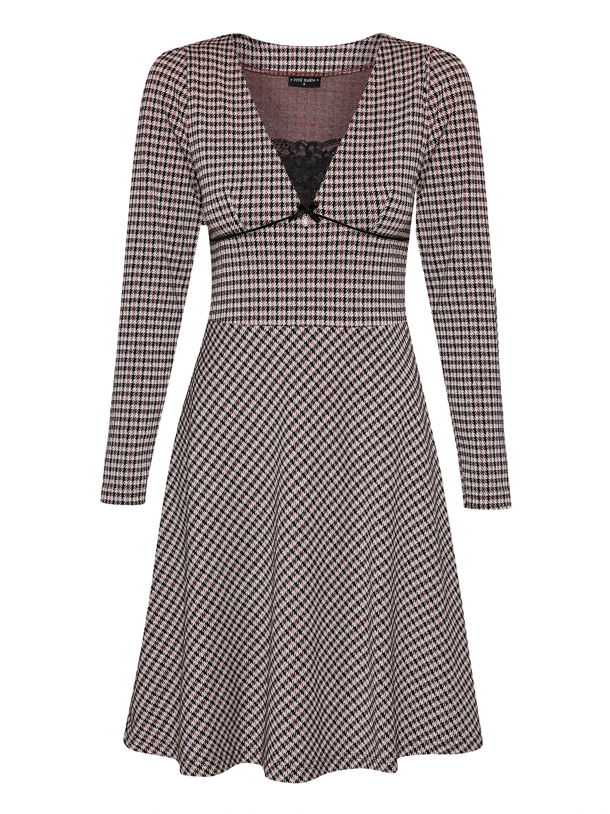 Dandy Time mit Vive Maria Das süße Vive Maria Kleid ist aus einem angenehmen Polyestermaterial mit Viskose und Elsathan-Anteil. Der Futterstoff ist aus Polyester und die eingesetzte Spitze ist aus einem Polyamid-Elsthan-Gemisch. Der Druck zeigt ein schwarzes Karomuster auf cremefarbenem Stoff. Das Vive Maria Kleid ist in sanfter A-Linie geschnitten und hat lange, schmalgeschnittene Arme. Der tiefe V-Ausschnitt ist mit einem Einsatz aus transparenter schwarzer Spitze hinterlegt. Eine Teilungsnaht auf Taillenhöhe trennt das figurbetonte Oberteil vom leicht ausgestellten Rockteil. Dieser ist unterfüttert, so dass er angenehm um die Beine fällt. Das Dandy Time Kleid von Vive Maria ist ein schicker Alltagsbegleiter, der super ins Büro passt und zum anschließenden Abendessen. Kombiniert weren kann das Kleid mit Stiefeln oder Stiefeletten sowie einer schwarzen blickdichten Strumpfhose. Länge in Gr. S ca. 94 cm.