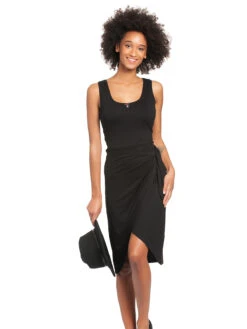 Ete Noir – ein Klassiker neu aufgelegt. Das extravagante Vive Maria Kleid ist aus einem leichten Viskosematerial mit Elasthananteil. Es ist enganliegend und figurbetont geschnitten. Das Kleid ist Trägerlos und wird am Armausschnitt sowie am runden Halsausschnitt mit einer schwarzen Stoffblende abgeschlossen. Eine rote Satinrose swoie ein kleiner Metallanhänger zieren den Ausschnitt. Eine Teilungsnaht auf Taillenhöhe trennt das schlichte Oberteil vom ausgefallenen Rockteil. Dieser wird, ähnlich wie bei einem Wickelkleid, vorne übereinander geschlagen und seitlich verknotet. Die Schnittteile sind abgerundet, sodass eine kleine Öffnung und somit ein Beinschlitz entsteht. Das neu aufgelegte kleine schwarze, dass in keinem Kleiderschrank fehlen sollte. Das ‚Ete Noir‘ Kleid ist absolut aufregend und kann sowohl bei einer Abendveranstaltung als auch im Alltag getragen werden – je nachdem wie man es kombinieren möchte. Mit Sandaletten unterstreicht es die Sinnlichkeit einer jeden Frau, mit Boots oder Sneakern bietet es ein absolutes Kontrastprogramm. Beides ist möglich.