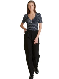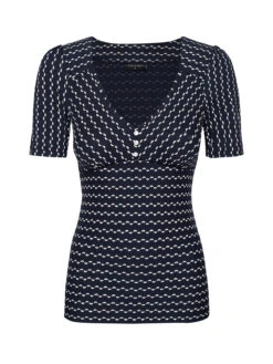 Das sĂĽĂźe Vive Maria Shirt ist aus einem angenehmen Viskosematerial mit Elasthananteil. Ein helles Muster ziert einen blauen Stoff. – figurbetontes Shirt mit halblangen Armen – V-Ausschnitt mit Zierknöpfen – Stretchsatinpaspel als Unterbrustnaht Länge in Gr. S ca. 58 cm