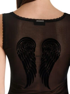 Das Vive Maria Wäscheset besteht aus einem Hemdchen und einem Panty. Beides ist aus einem Baumwoll-Modal-Gemisch. Der transparente Tüllstoff ist aus leichtem Polyester. – figurnahe Passform – breite Träger – großer runder Halsausschnitt mit Häkellitze – Rückseite aus transparentem Tüllstoff, Flockdruck mit Engelsflügeln Länge in Gr. S ca. 56 cm – Höschen mit Satingummibund, Schleife und Metallanhänger – Litzenverzierung am Beinausschnitt – Schriftzug ‚Fallen Angel‘ hinten Vordere Länge bis Zwickelnaht ca. 24 cm