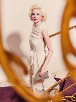 Das traumhaft schöne Vive Maria Kleid ist aus einem leichten Viskosematerial. Der Futterstoff ist aus angenehmer Viskose. Das Kleid ist Ă„rmellos und hat einen kleinen Stehkragen. Genähte Biesen sowie eine aufgesetzte RĂĽsche zieren den Brustbereich. Ein eingezogener Gummi in Taillenhöhe wird von einem BindegĂĽrel ĂĽberdeckt. Im leicht ausgestellten Rockteil gibt es ebenfalls noch mal zwei aufgestzte RĂĽschen, die das Kleid optisch auflockern. Ab dem Brustbereich ist das Kleid mit einem cremefarbenen Viskosestoff gefĂĽttert, sodass es blickdicht ist. Die leichte Spitze zeigt eine florale Streifenoptik. Das ‚For Colette Dress‘ ist ein absolut sĂĽĂźes Party Kleid, mit dem du nicht nur barfuss am Strand tranzen kannst, sondern auch in High Heels eine tolle Figur machst.