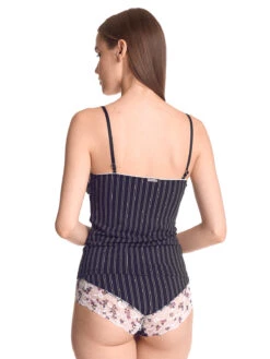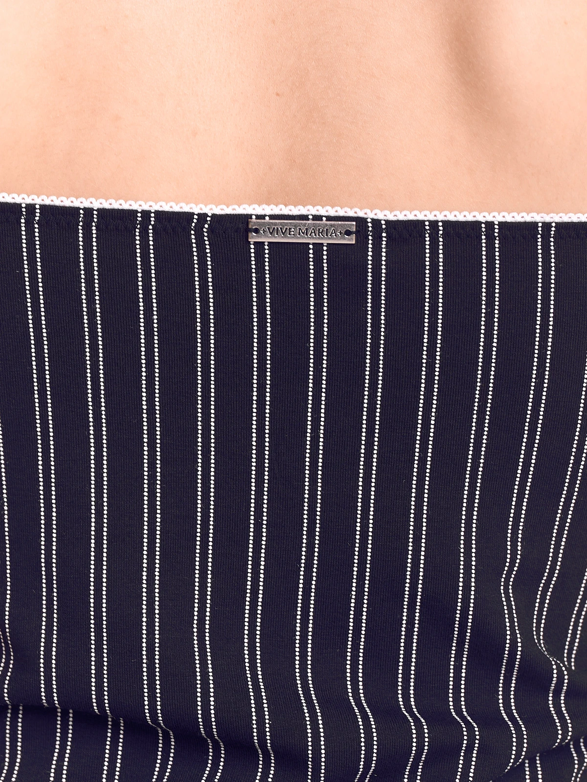 French Dandy mit Vive Maria Das süße Vive Maria Wäscheset besteht aus zwei Teilen und ist aus einem angenehmen Viskosematerial mit Elasthananteil. Die eingesetzte Spitze ist aus einem Polyamid-Elasthan-Gemisch. Das figurbetonte Hemdchen hat dünne verstellbare Träger, die mit einer kleinen Satinschleife verziert sind. Der tiefe V-Ausschnitt ist mit einer breiten Bordüre aus bedruckter Spitze verziert. Eine satinschleife sowie Metallanhänger zieren den Dekolleteebereich. Eine Unterbrustnaht sorft für einen guten Sitz. Das Muster zeigt kleine helle Punkte, die in doppelten Linien, ähnlich Nadelstreifen, angeordnet sind. Länge in Gr. S ohne Träger ca. 40 cm. Das Pantyhöschen hat einen Satingummibund, der mit einer Satinschleife und einem Metallanhänger verziert ist. Transparente bedruckte Spitze ist seitlich wie hinten eingesetzt. Vordere Länge bis Zwickelnaht ca. 25 cm.