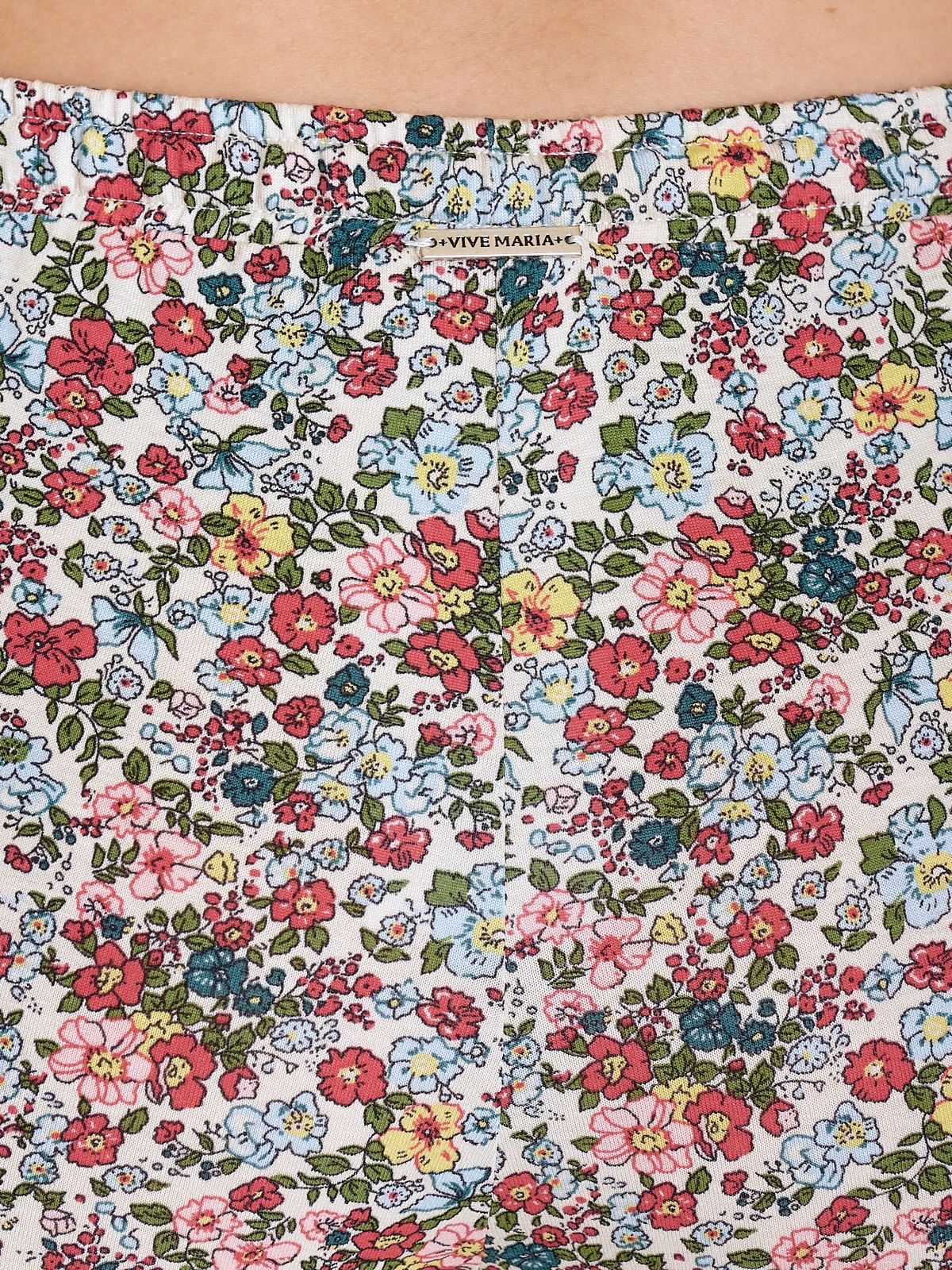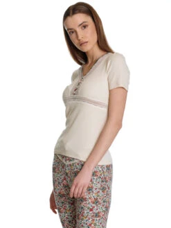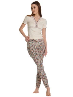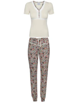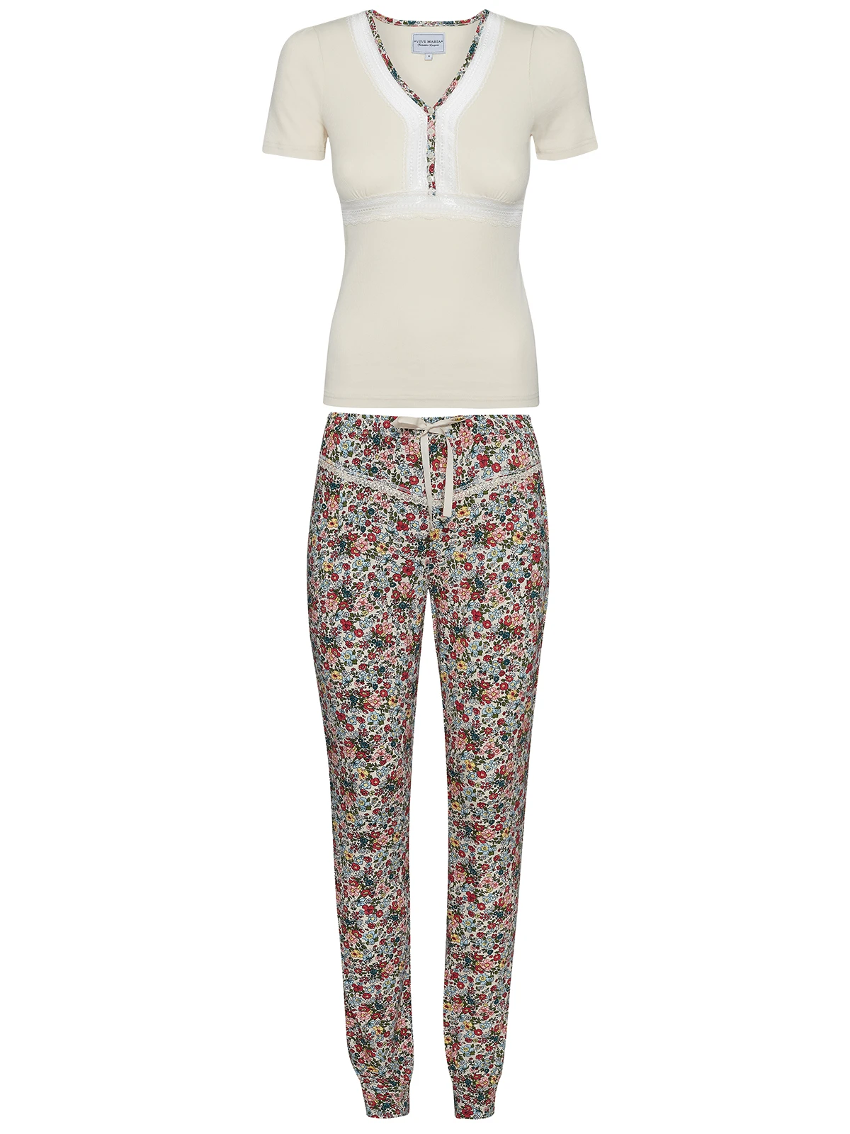 Der Vive Maria Pyjama besteht aus einem Ober- und Unterteil – figurbetontes Oberteil mit kurzen Armen – V-Ausschnitt mit transparenteer Spitzenbordüre und geblümten Einfassband, passend zur Hose – Zierknöpfe und Unterbrustnaht aus transparenter Spitze – cremefarbener Rippstoff – angenehmes Baumwollmaterial mit Elasthananteil – kann schmaler ausfallen Länge in Gr. S ca. 58 cm – schmal geschnittene Pyjamahose in 7/8-Länge – schmale Bündchen in Stofffarbe als Beinabschluss – Ziernähte und Spitzenverzierung im vorderen Bereich – bunter Blumenprint auf cremefarbenem Stoff – leichtes Viskosematerial mit Elasthananteil Innenbeinlänge in Gr. S ca. 76 cm