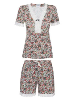 Der Vive Maria Pyjama besteht aus einem Ober- und Unterteil und ist aus einem angenehmen Viskosematerial mit Elasthananteil. Ein Blumenprint ziert cremefarbenen Stoff. – figurbetontes Oberteil mit kurzen Armen und transparenten SpitzenabschlĂĽssen – V-Ausschnitt mit transparenter Spitze, Satinschleife und Zierknöpfen – abgesteppte Biesen im vorderen Schulterbereich Länge in Gr. S ca. 59 cm – kurze Pyjamapants mit transparenten SptzenabschlĂĽssen – breiter Gummibund mit zusätzlichem Bindeband zur Weitenregulierung – seitliche Eingrifftaschen Innenbeinlänge in Gr. S ca. 13 cm