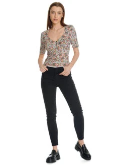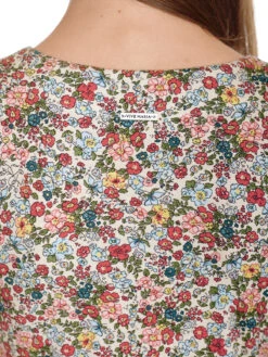 Das süße Vive Maria Shirt ist aus einem leichten Viskosematerial mit Elasthananteil. Der Druck zeigt bunte Sommerblumen auf cremefarbenem Stoff. – figurbetonte Passform – kurze Arme – V-Ausschnitt mit verstürztem Schnitteil im vorderen Schulterbereich, Knopfleiste – geschwungene Unterbrustnaht Länge in Gr. S ca. 60 cm