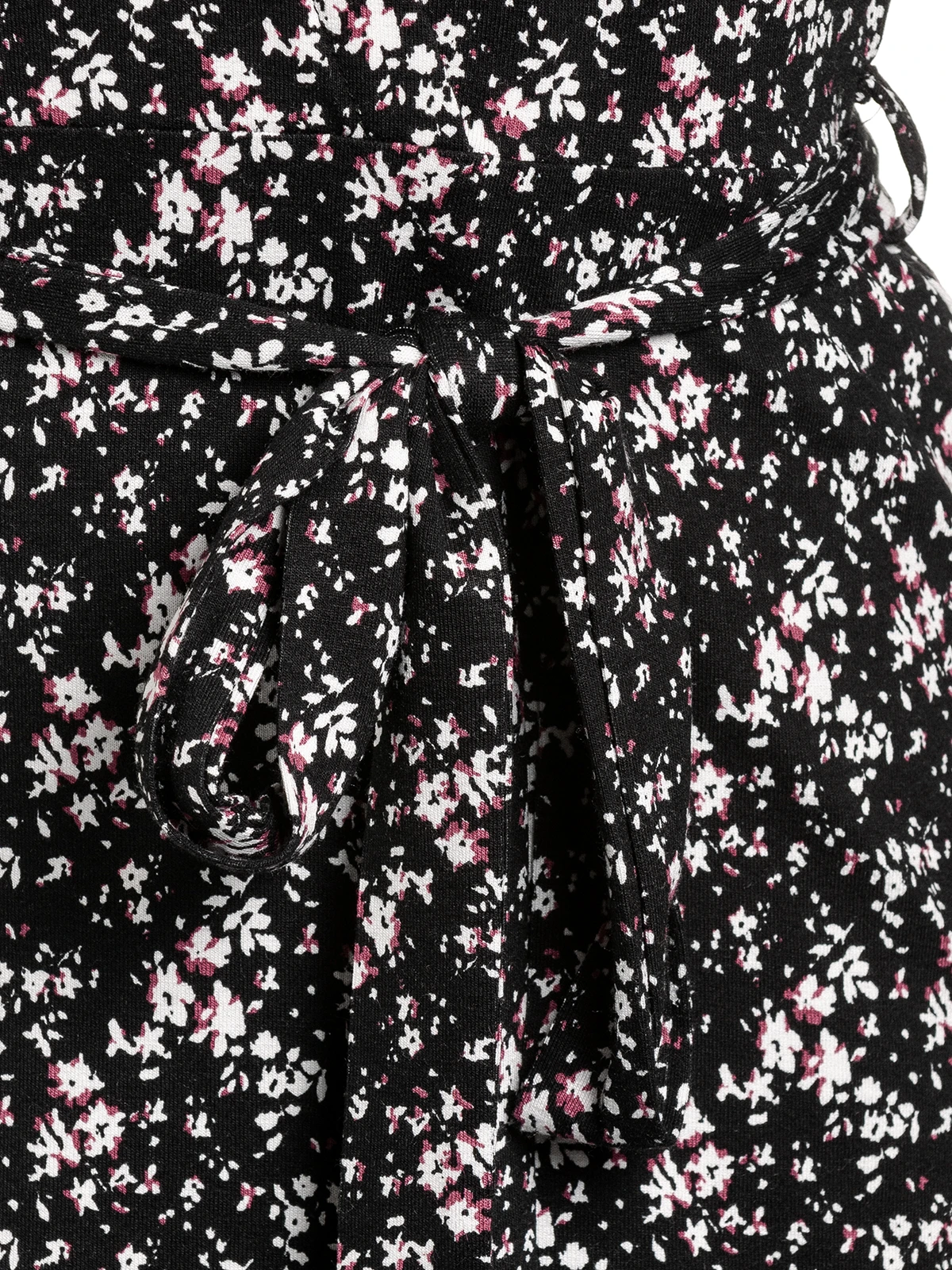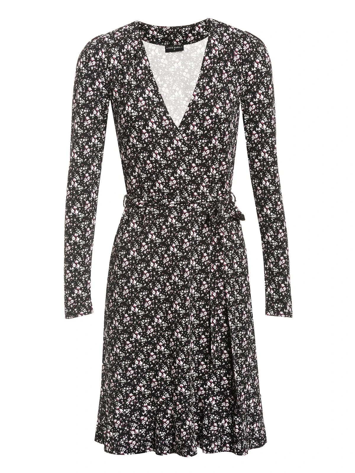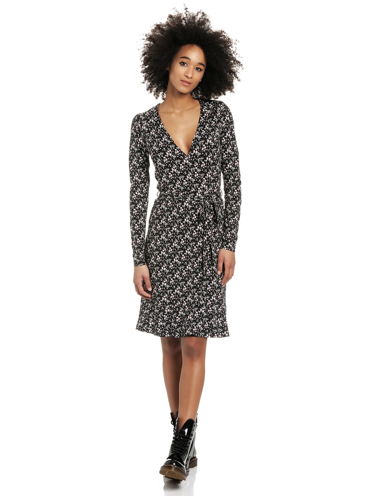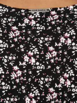 Das sĂĽĂźe Vive Maria Kleid ist aus einem angenehmen Viskosematerial mit Elasthananteil. Es ist figurbeont und in Wickeloptik geschnitten. Es hat lange Arme und einen groĂźen V-Ausschnitt. Ein BindegĂĽrtel in Stofffarbe ĂĽberdeckt die Teilungsnaht auf Taillenhöhe, die das figurbetonte Oberteil vom leicht ausgestellten Rockteil trennt. Durch den Unterstoff fällt der Rockteil angenehm um die Beine. Der Druck zeigt kleine Blumen auf schwarzem Stoff. Das ‚French Girl Dress‘ ist der perfekte Begleiter fĂĽrs BĂĽro oder den Alltag. Der Blumenprint wirkt feminin und romantisch.
