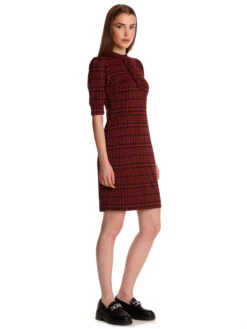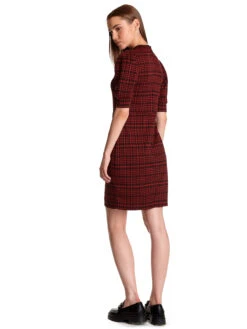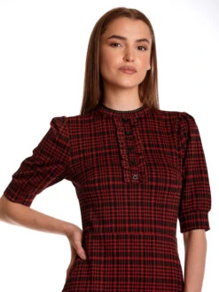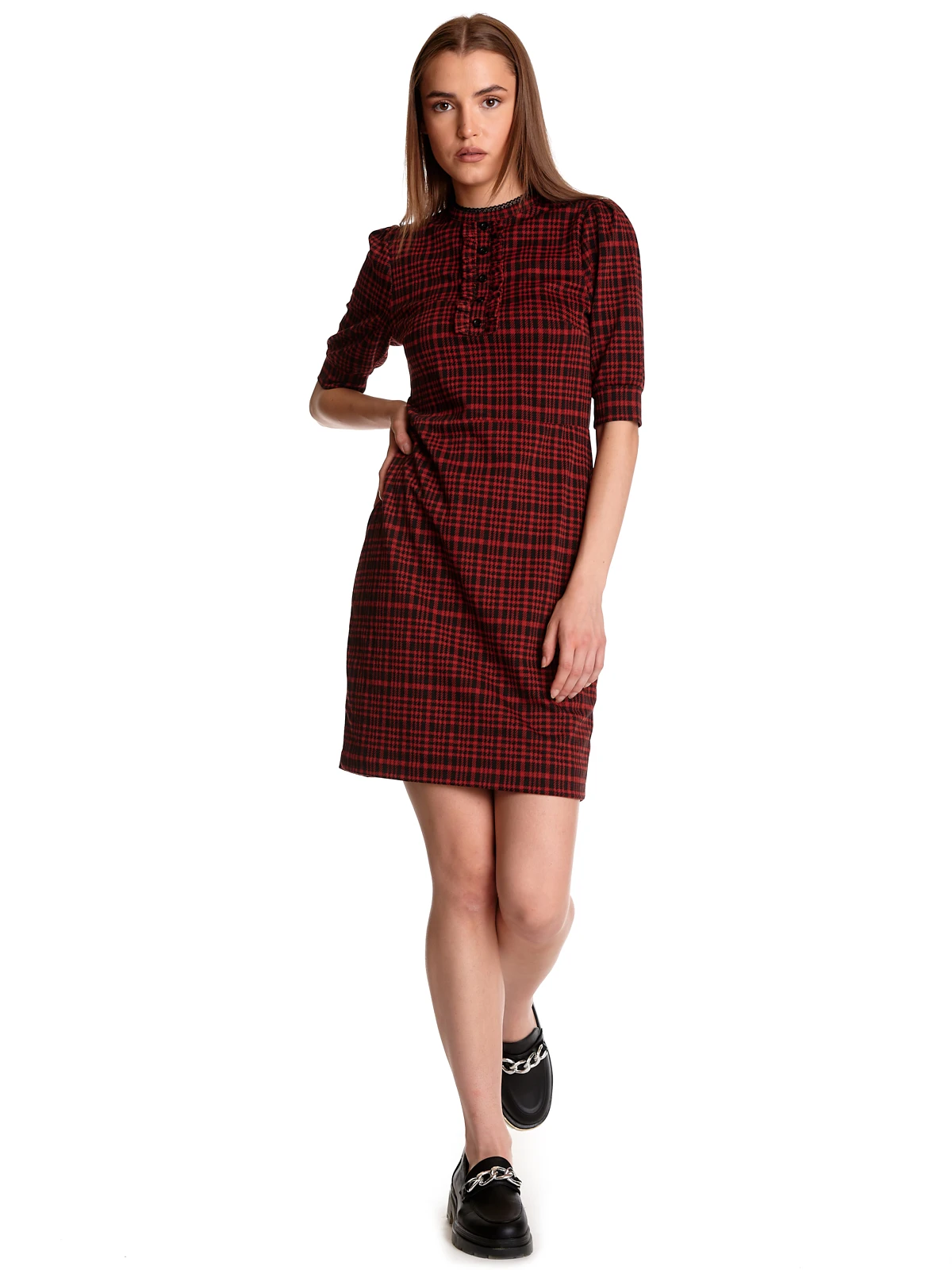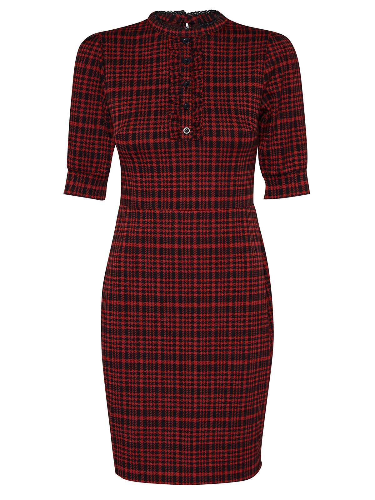 Das wunderschöne Vive Maria Kleid ist aus einem angenehmen Materialmix aus Polyester, Viskose und Elasthan. Das Futter im Rockteil ist aus Polyester. Das Kleid ist figurbetont und enganliegend geschnitten und hat kurze Arme, die mit einer schmalen Stoffblende abgeschlossen werden. Der runde Halsausschnitt geht direkt in einen kleinen Stehkragen ĂĽber, der mit einer dĂĽnne Spitzenborte abgeschlossen wird. Im Nacken wird der Kragen mit einem Knopf und einer Gummischlaufe geschlossen, sodass ein kleiner Schlitz entsteht. Auf dem Brustbereich befindet sich eine RĂĽschenleiste mit Zierknöpfen. Der dicke Jersey Jaquard hat ein rot-schwarzes Karomuster. Das ‚Gambling Club Dress‘ ist ein toller Begleiter fĂĽr das office und passt hervorragend zu Halbschuhen oder Boots.