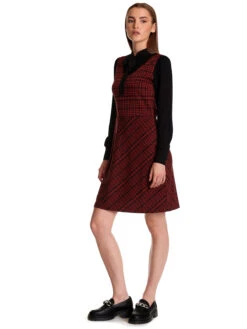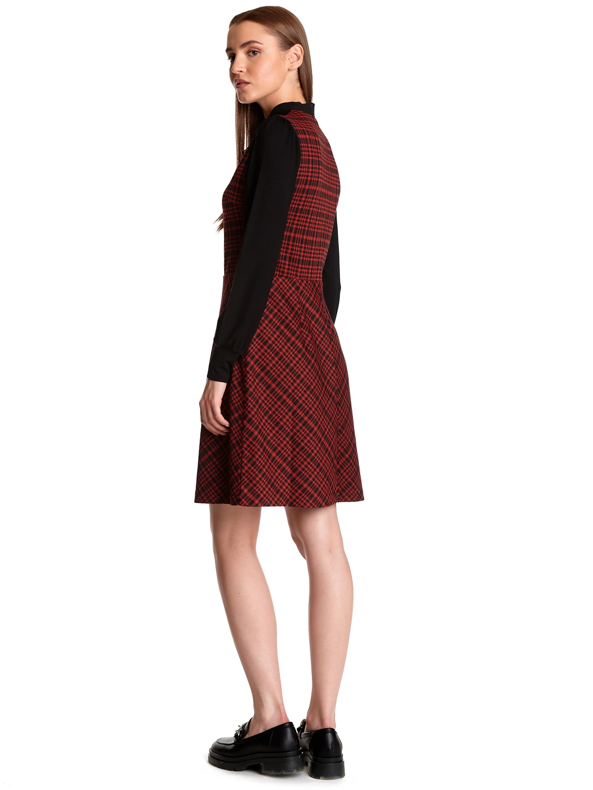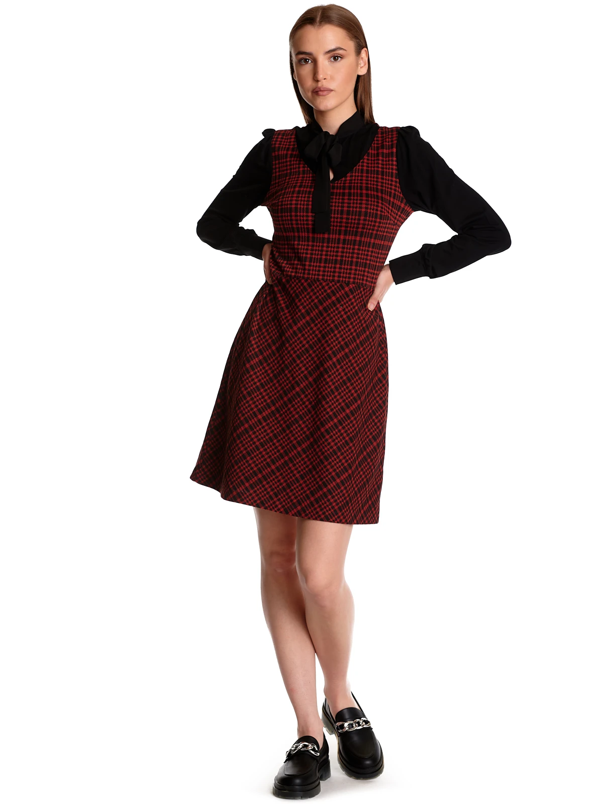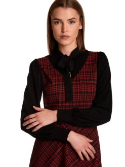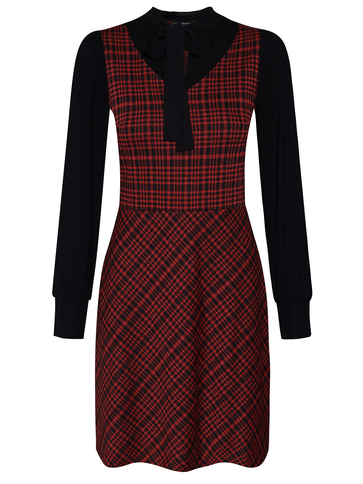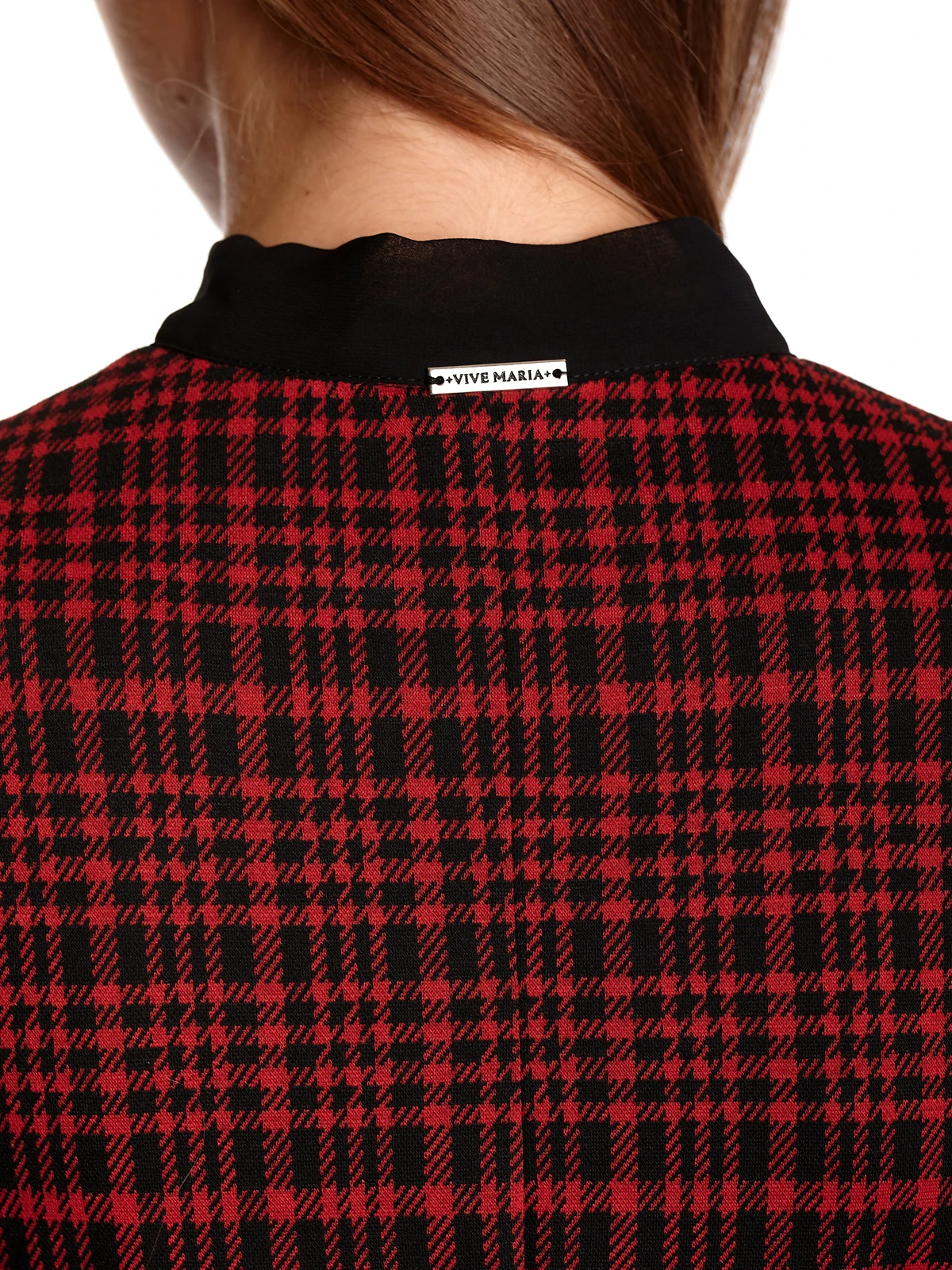 Das wunderschöne Vive Maria Kleid ist aus einem angenehmen Viskosematerial mit Elasthananteil. Der Futterstoff im Rockteil ist aus Polyester. Das Kleid ist figurbetont und in sanfter A-Linie geschnitten. Die langen Ă„rmel sind aus einem schwarzen Stoff gefertigt und werden mit breiten Manschetten abgeschlossen. Ein kleiner Stehkragen, der aus einem Chiffonband gefertigt ist, wird vorne zu einer Schleife gebunden, wodurch ein kleines Guckloch entsteht. Eine Teilungsnaht auf Taillenhöhe trennt das figurbetonte Oberteil vom leicht ausgestellten Rockteil. Das Kleid ist aus einem dicken Jersey Jaquard und ist rot schwarz kariert. Das ‚Gambling Dress‘ ĂĽberzeugt als winterlichtes Blusenkleid und ist der perfekte Begleiter fĂĽr den BĂĽroalltag.
