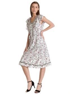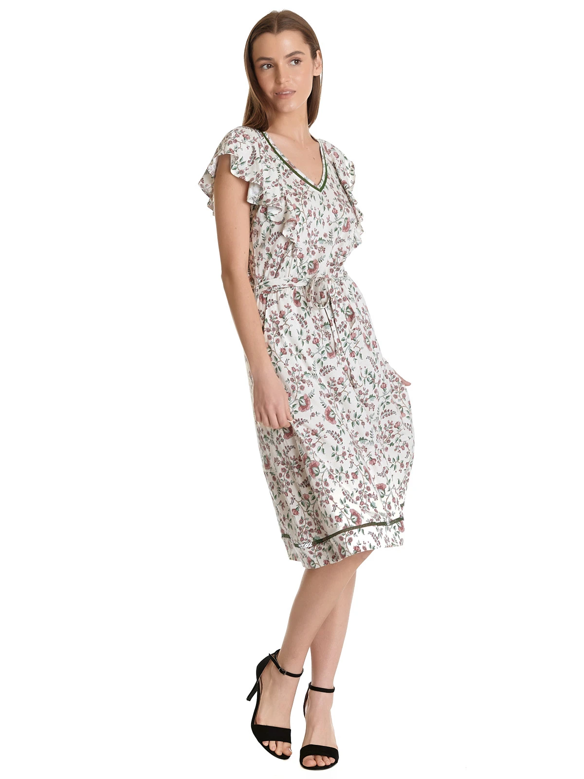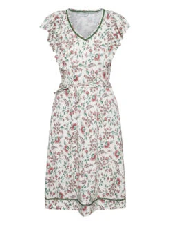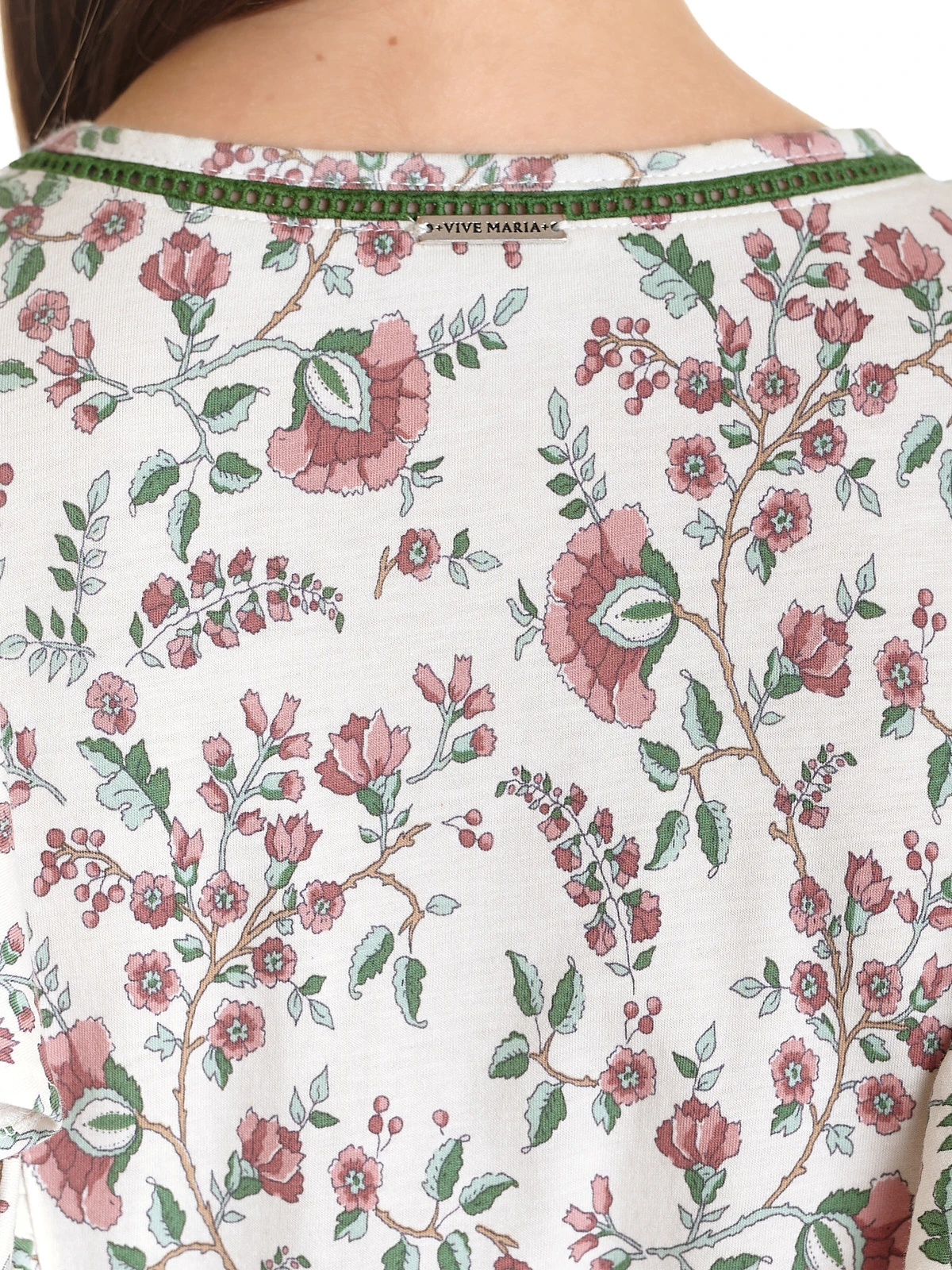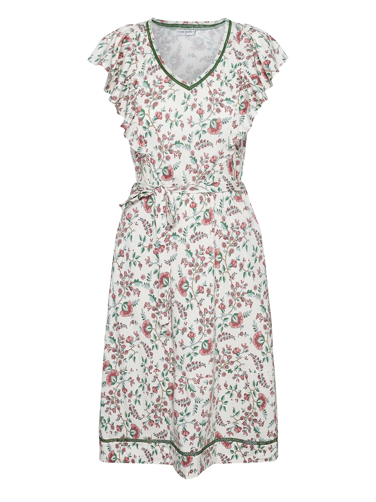 – sommerliches Vive Maria Kleid aus einem angenehmen Baumwoll-Modal-Gemisch, der Futterstoff ist aus Polyester – locker geschnittenes Kleid mit leichter A-linie und V-Ausschnitt – angesetzter Volant dient als Ă„rmel – Gummizug auf Taillenhöhe wird mit BindegĂĽrtel in Stofffarbe ĂĽberdeckt – seitlche Eingrifftaschen fĂĽr lässigen Look – Saumabschluss mit angesetzem Volant und SpitzenbordĂĽre – hĂĽbscher Blumenprint auf cremefarbenem Stoff – Rockteil gefĂĽttert – Länge in Gr. S ca. 112 cm
