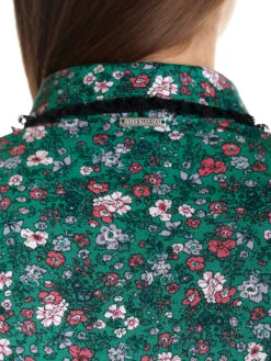 Vive Maria Shirtbluse aus einem angenehmen Viskose-Elasthangemisch, Blumenprint auf grünem Stoff – gerade geschnittene Bluse – kurze Arme mit gesmokten Armabschlüssen – Blusenkragen mit Spitzenverzierung und Chiffonband zum Binden – runder Halsausschnitt mit Knopfschließe vorne und kleinem Guckloch Länge in Gr. S ca. 60 cm