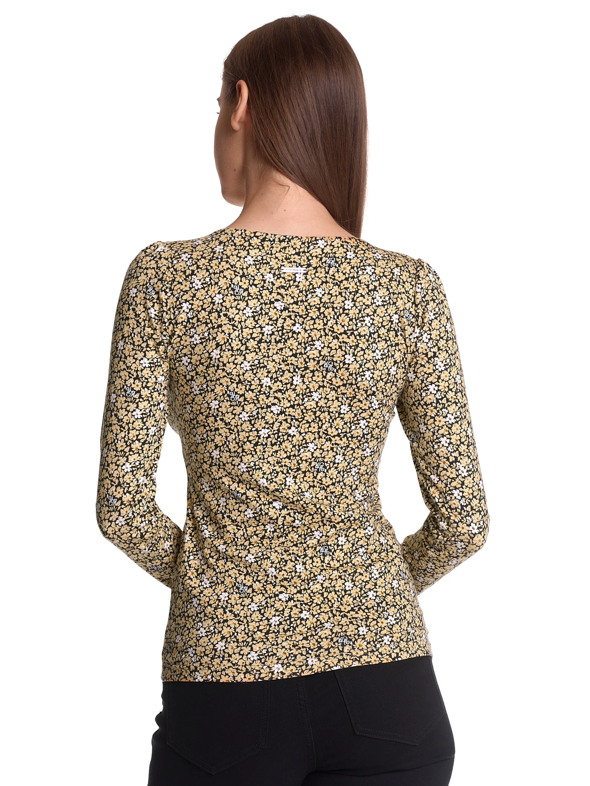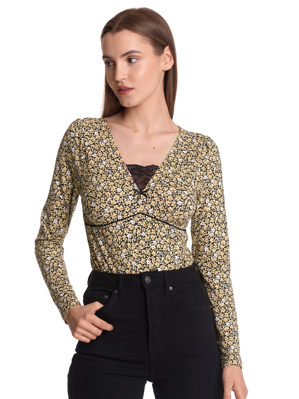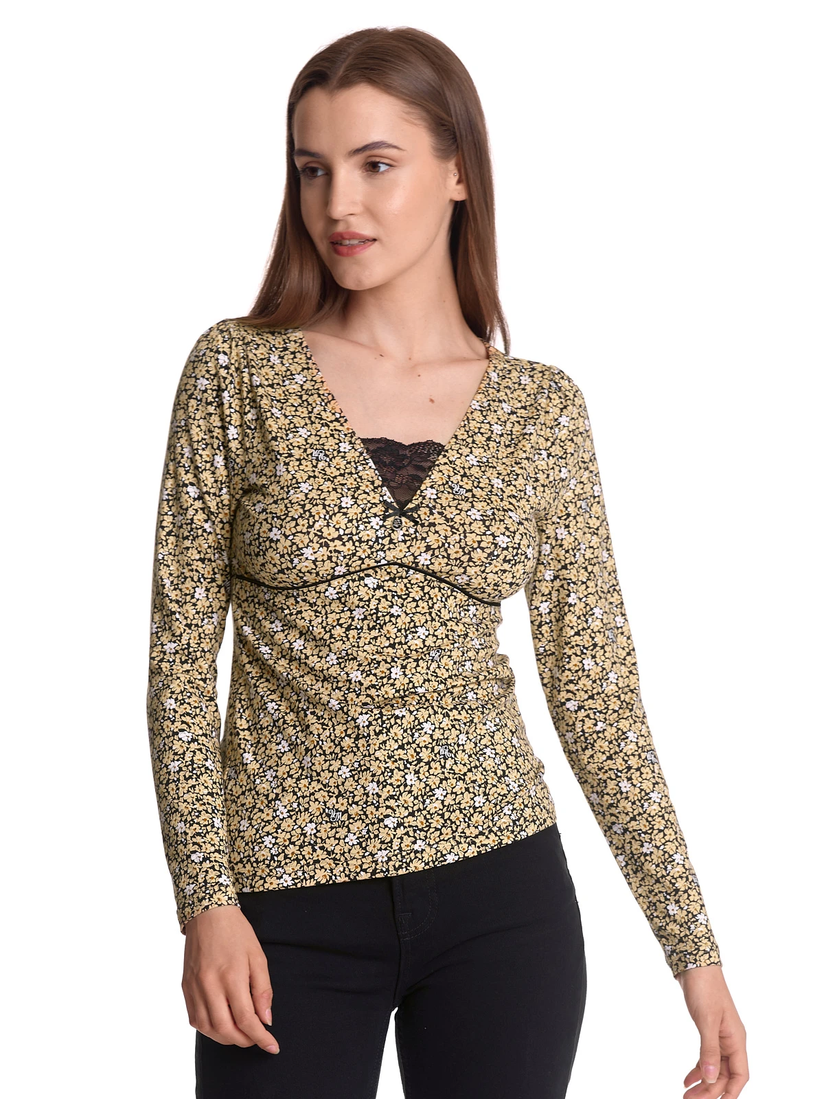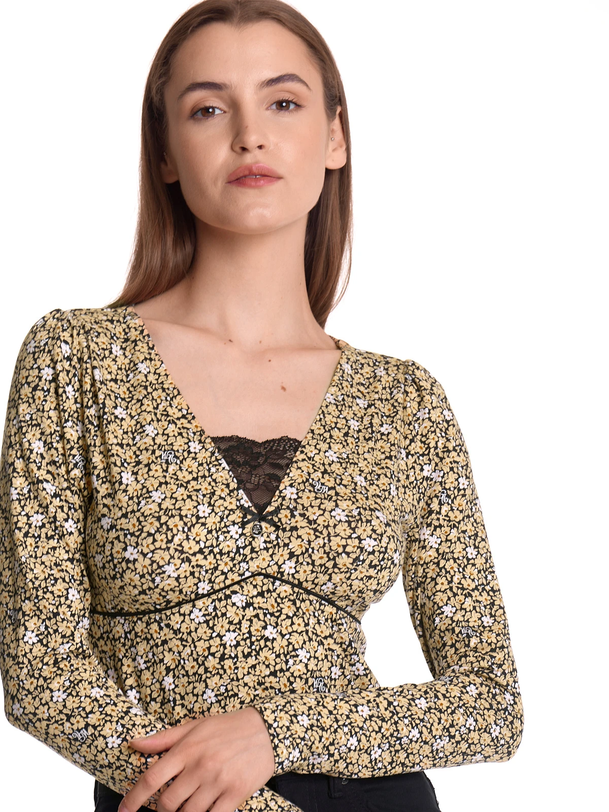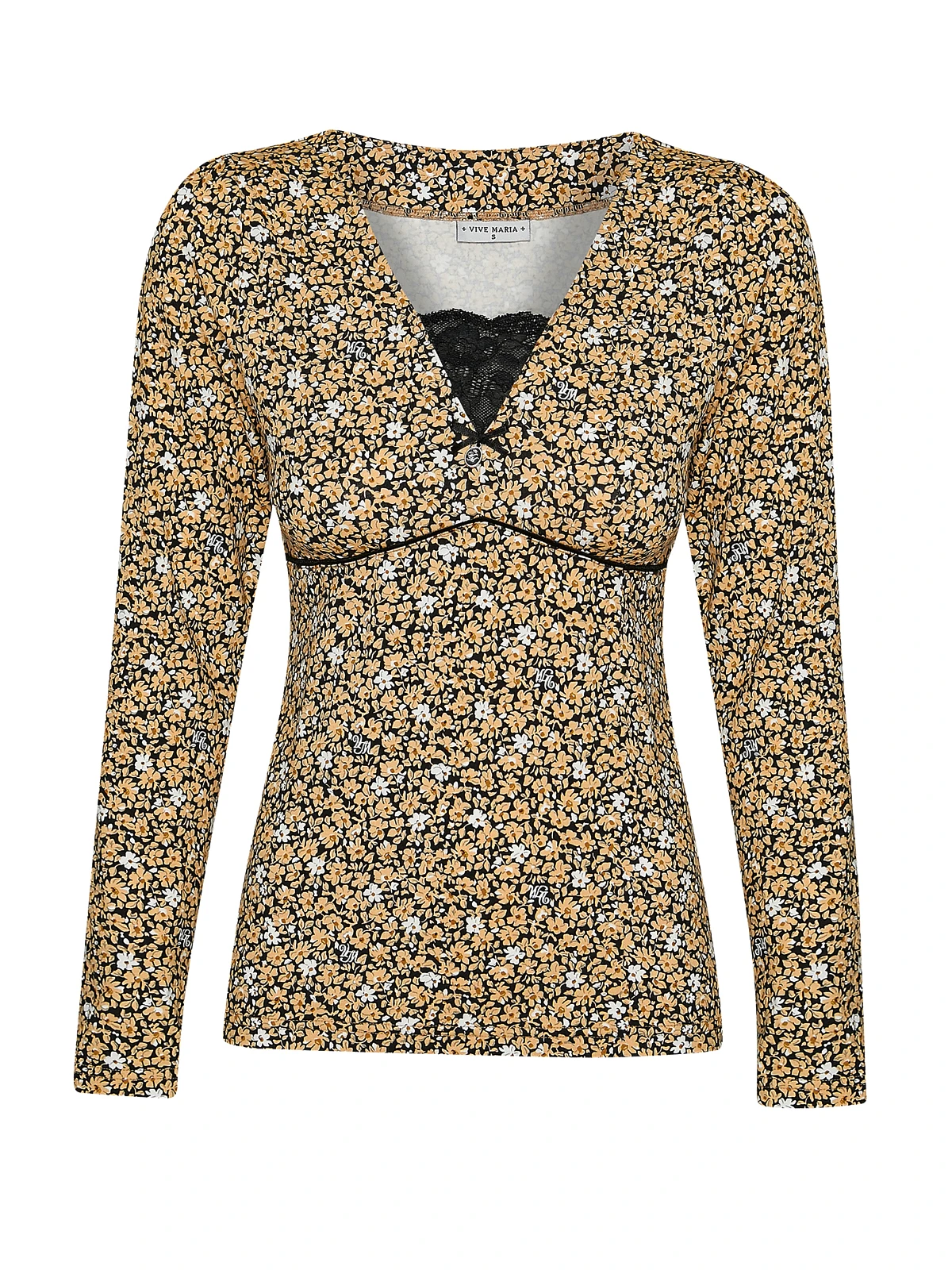Golden Flower mit Vive Maria Das wunderschöne Vive Maria Shirt ist aus einem angenehmen Viskosematerial mit Elasthananteil. Es ist figurbetont geschnitten und hat lange Arme. Der tiefe V-Ausschnitt ist mit schwarzer, transparenter Spitze hinterlegt. Den Dekolleteebereich zieren eine kleine Satinschleife sowie ein Metallanhänger. Eine unterbrustnaht sorgt für einen guten Sitz. Das Muster zeigt viele kleine Blüten in einer Farbischung aus creme und curry. Das wundervolle ‚Golden Flower‘ Shirt von Vive Maria sieht super süß aus zu Jeans und Ankle Boots. Länge in Gr. S ca. 58 cm.